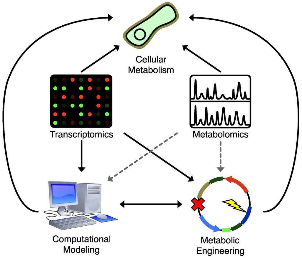 Applications of various techniques to understanding and manipulating cellular metabolism. Solid lines represent widely used strategies, dashed lines represent underused strategies. Both metabolomics and transcriptional profiling provide a direct readout that helps enable a deeper understanding of cellular metabolism, but only transcriptional profiling has seen widespread application to enhance standard computational modeling and metabolic engineering strategies. Integrating metabolomics data into metabolic engineering and computational modeling strategies would help bridge gaps in biochemical knowledge and improve our ability to control cellular metabolism.