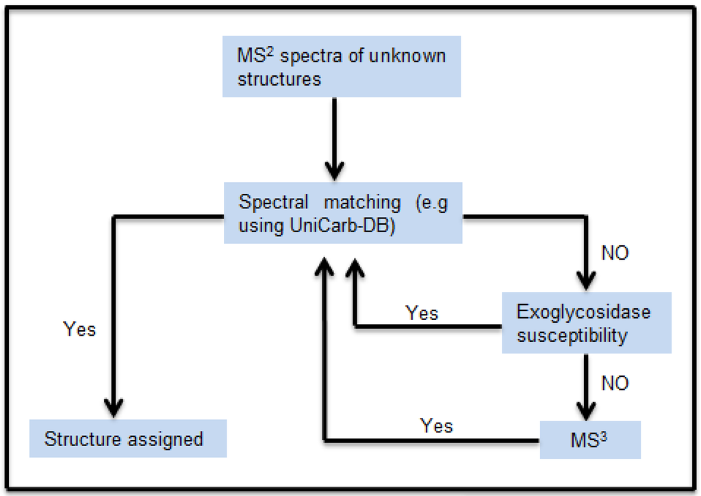 The schematic workflow in Figure 1 shows how the MS2 peak list (m/z and relative intensity) of the isolated chromatographic peaks were compared with the MS2 peak list of the structures reported in the MS2 glycomic database UniCarb-DB. The structures, in particular sialylated structures, which did not give a good match, were exoglycosidase digested (in particular de-sialylated). The MS2 peak list of the exoglycosidase products generated were again compared with the MS2 peak list of the structures reported in the MS2 database UniCarb-DB. For structures wherein a specific exoglycosidase was lacking, an MS3 approach was used. The MS3 peak lists of unknown structures were compared with the MS2 peak lists from the UniCarb-DB database (if fragments were Y-ions), or compared MS3 spectra of fragments generated from standards.
