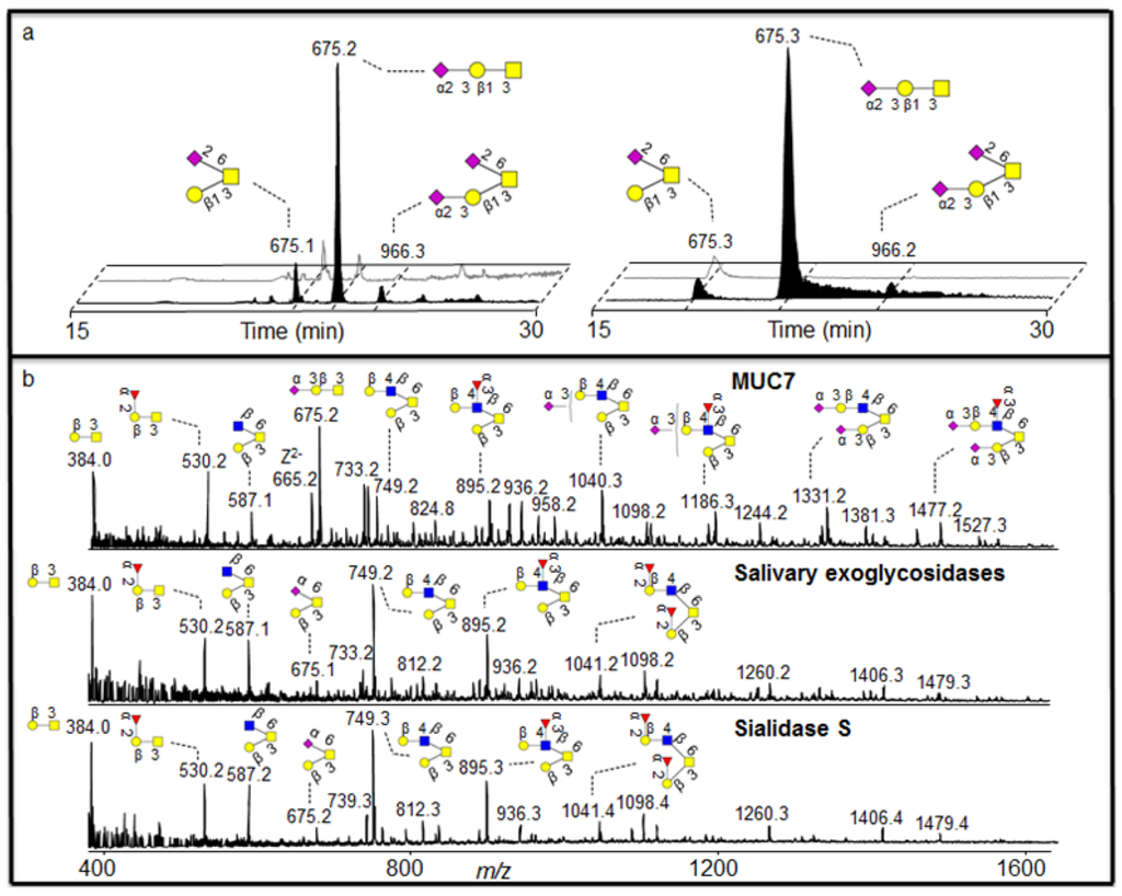 Linkage specific sialidase activity of saliva. (a) SIC of m/z 675 and 966 before (front) and after (back) incubation with saliva (left) and sialidase S (right) showing linkage specific sialidase activity of saliva. (b) Negative ion MS profile of MUC7 oligosaccharides before and after treatment with saliva and sialidase S. For explanation of symbols, see legend in Table 1.