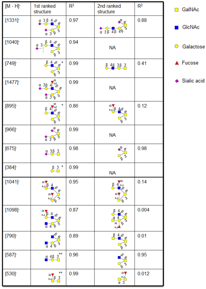 The MS2 spectral intensity correlation comparison of the sialylated and neutral structures with spectra reported in the MS2 database UniCarb-DB. The sialylated structures did not give a good match due to loss of labile sialic acid leaving behind very little information. The R2 value is a measure of how well all peaks and their intensities in an MS2 spectrum are matching with the database peak list. Symbols used are according to the Consortium for Functional Glycomics guidelines [20] and was generated by Glycoworkbench [21].*indicates structures that are created after de-sialylation.** indicates structures created after loss of terminal GlcNAc.