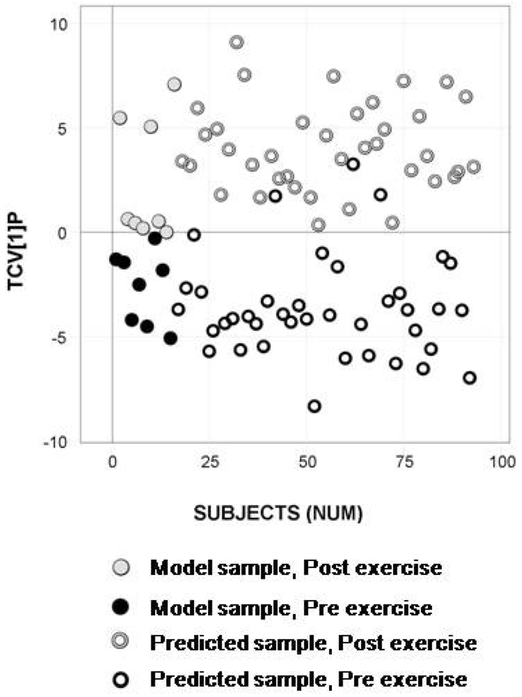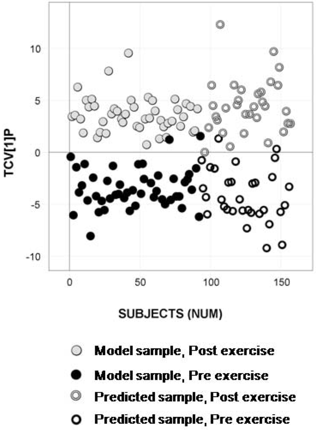 Longitudinal sample predictions in the classification model for the entire sample set. OPLS-DA predictive score plot for the model based on the 93 samples from exercise occasions one and two showing separation between pre- exercise (black circles) and post- exercise (gray circles) serum samples (Class prediction (CV): 97.8%). Predicted test samples from exercise occasions three and four marked as open circles display high predictive classification accuracy (Class prediction (Test set): 92.2%) for pre- exercise samples (black open circles) and post- exercise samples (gray open circles).