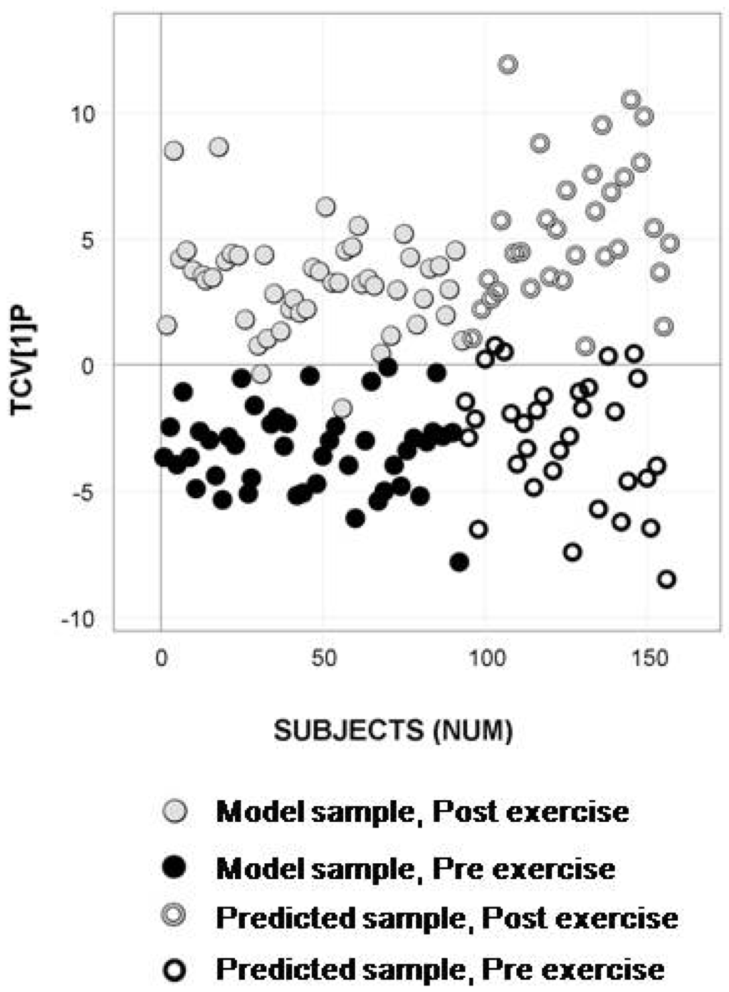 Additional samples from exercise occasions three and four (n = 64) were used to investigate the methods ability as a means for predictively verifying a detected metabolic marker pattern in longitudinal studies, i.e., its potential as a diagnostic tool. Exercise occasions three and four were performed by the same male subjects in conjunction with the other tests, but the samples were characterized analytically by GC/TOFMS eight months later. The idea here was to use each subset to extract a significantly separating metabolic marker pattern using the previously described permutation test and verify the pattern by means of classification of the samples from the additional exercise occasions. This was done by first assigning a predicted class membership (pre- or post- exercise) to each sample from exercise occasions one and two, which was used to update the existing models. The samples from exercise occasions three and four were then predictively resolved, using the reference table for the model samples, and classified by prediction into the new OPLS-DA models based on the significantly separating metabolic marker patterns.