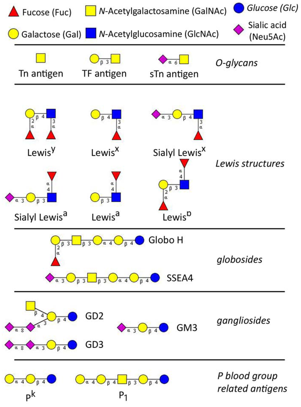 Globo H, a fucosylgalactosylgloboside, was originally characterized by Hakomori and co-workers in a human breast cancer cell line [171]. Expression of Globo H (both as GSL and glycoprotein) in 143 cases of breast cancer was not correlated with patient survival [172]. Using glycan array a significant difference in anti- Globo H antibody levels in serum of breast cancer patients and healthy donors was demonstrated, and the increase of Globo H in breast cancer stem cells was associated with the disease progression [53]. Globo H was also found to be expressed in ovarian cancer [2,173].