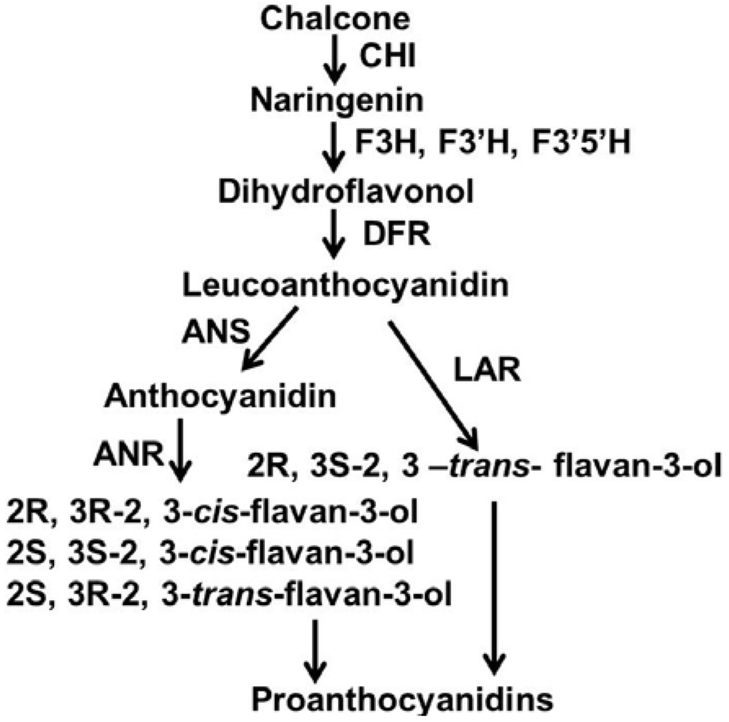 The biosynthetic pathway of grape proanthocyanidins starting with chalcone. CHI: chalcone isomerase; F3H, flavanone-3-hydroxylase; F3'H, flavonoid 3'-hydroxylase; F3'5'H, flavonoid 3',5'-hydroxylase; DFR, dihydroflavonol reductase; LAR, leucoanthocyanidin reductase; ANS, anthocyanidin synthase; ANR, anthocyanidin reductase.