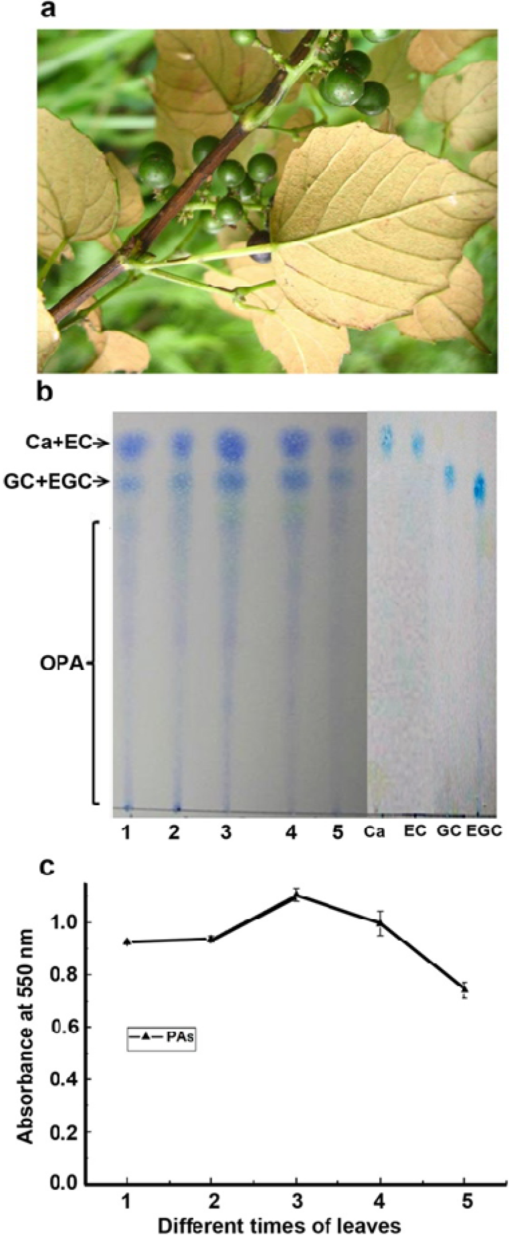An image of leaves and green berries of Vitis bellula and analysis of PAs in leaves at different development stages. (a). morphologies of leaves and unripen green berries; (b). images of PA profiles visualized by 0.1% DMACA on a TLC plate, Ca+EC: (+)-catechin and (−)-epicatechin, GC+EGC: (-)-gallocatechin and (−)-epigallocatechin, OPA: oligomeric PAs; (c). comparison of PA levels at different times of leaf development from young (numerated as 1) through fully expanded time (numerated as 5), 1: less than 0.5 cm, 2: 0.5–1.0 cm, 3: 1.0–1.5 cm, 4: 1.5–2.0 cm and 5: longer than 2.0 cm to fully expanded (4–5 cm in length). Crude extracts of PAs were boiled in butanol: HCl 1 hr to produce anthocyanidins, the absorbance values of which were measured at 550 nm.