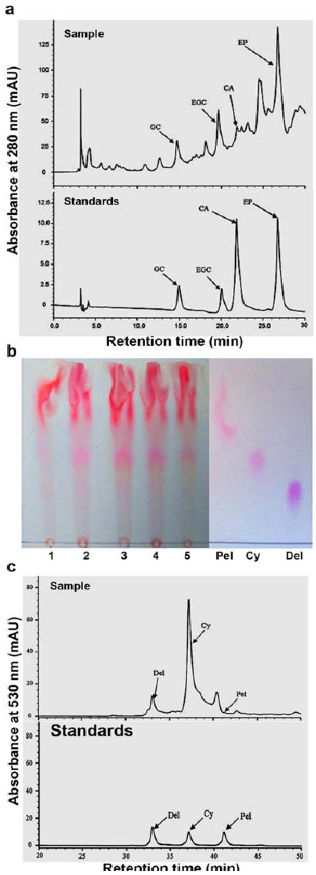 HPLC profiling of flavan-3-ols and TLC analysis of proanthocyanidins in leaves of Vitis bellula. (a). A HPLC profile shows (±)-catechin (CA), (-)-epicatechin (EP), (−)-gallocatechin (GC) and (−)-epigallocatechin (EGC) in crude extracts of leaves (stage 3); (b). A TLC image shows anthocyanidin profiles released from the butanol: HCl boiling of crude extracts of proanthocyanidins from leaves (stage 3), authentic standards including: cyanidin (Cy), pelargonidin (Pel) and delphinidin (Del); (c). A HPLC profile shows anthocyanidins released from the butanol: HCl boiling of crude extracts of proanthocyanidins from leaves (stage 3), authentic standards including: cyanidin (Cy), pelargonidin (Pel) and delphinidin (Del).