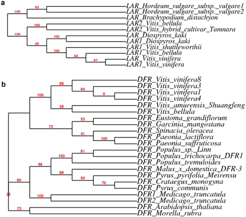 Cladogram style phylogeny trees of DFR and LAR from certain species. (a). a phylogeny tree developed from 11 cDNA homolog sequences of LAR. (b). a phylogeny tree developed from selected 22 cDNA homolog sequences of DFR.