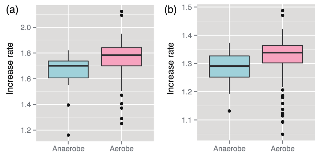 Median comparison of the increase rates between aerobes and anaerobes. The medians can be concluded to be significantly different between them in both case of the enzyme-based increase rates (a) (p-value p = 4.6 × 10−5 using the Wilcoxon–Mann–Whitney (WMW) test) and the metabolite-based increase rate (b) (p = 5.2 × 10−5 using the WMW test).
