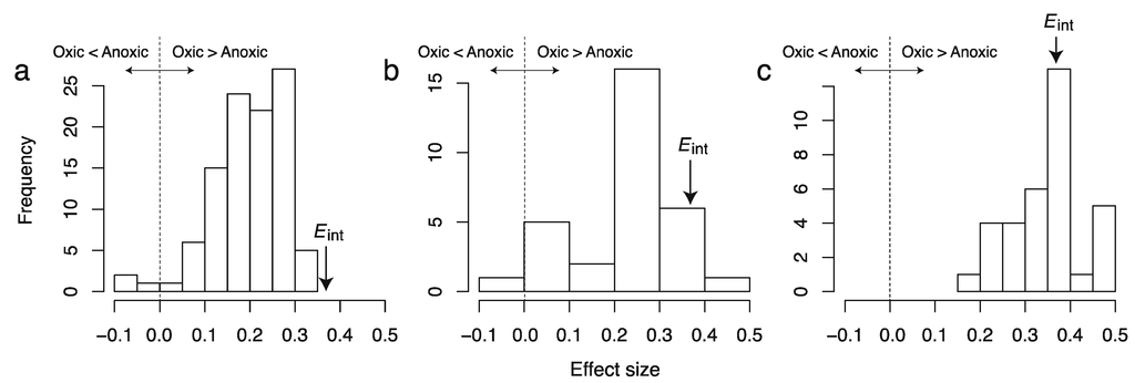 Distributions of effect sizes of the difference in AlogP98 between oxic and anoxic metabolites in individual metabolic networks of (a) aerobic bacteria, (b) unicellular eukaryotes, and (c) multicellular eukaryotes. Eint is the effect size obtained from the integral network.