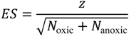 where z is the z-score calculated from the p-value obtained using the one-tailed WMW test and Noxic and Nanoxic are the number of oxic metabolites and the number of anoxic metabolites, respectively. Particularly, ES > 0 or ES < 0 indicates that a chemical property’s median of oxic metabolites is larger or smaller, respectively, than that of anoxic metabolites examined in this study.