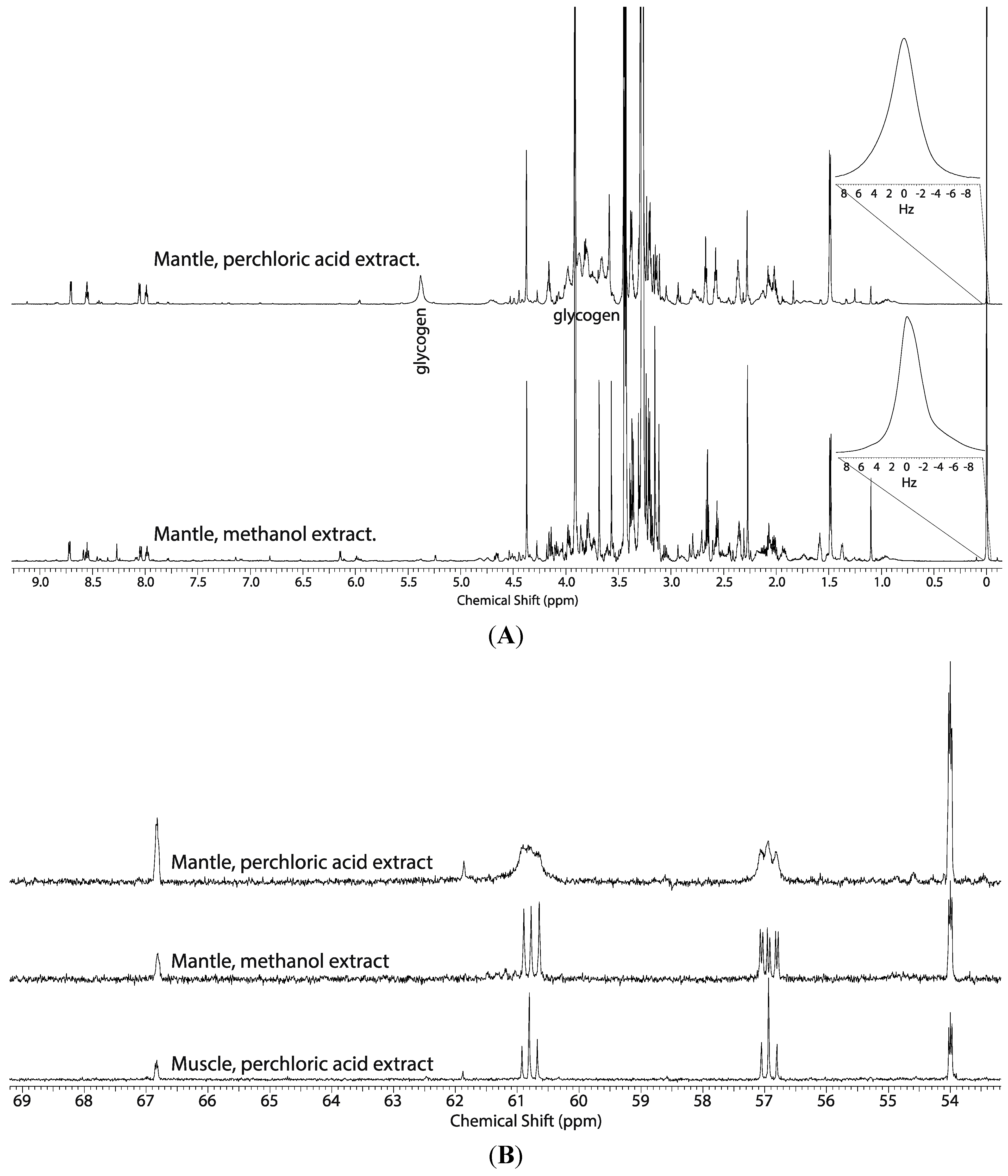 (A) Representative 1H NMR spectra of the mantle tissue block of oysters exposed to U-13C-glucose and extracted with 8% perchloric acid showing the broad resonances between 5.42 ppm and 3.25 ppm (top) and the increase in resolution in the same region due to precipitation of glycogen during extraction with methanol (bottom). (B) Representative portions of the 13C NMR spectra of the mantle tissue block from oysters exposed to seawater containing 2.7 mM 2-13C/15N-glycine and extracted with perchloric acid (top) and 50% methanol (middle), and perchloric acid extract of muscle (bottom) from oysters exposed to seawater containing 2.7 mM 2-13C-glycine.