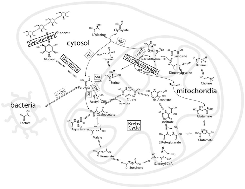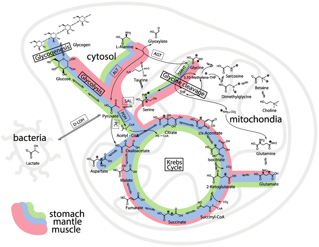 A schematic biochemical representation of the various known metabolic pathways in the oyster biosystem that were expected to be probed by U-13C-glucose and 2-13C/15N-glycine. The schematic map shows glycolysis, Krebs cycle, glycine and serine metabolism expected in the cell cytosol, mitochondria or symbiotic bacteria. The star and asterisk track the position of the 13C and 15N in metabolites of 2-13C/15N-glycine. The 13C-labeled metabolites of U-13C-glucose are not shown, but it would uniformly label glycogen, alanine, while the labeling pattern of glutamate formed by the Krebs cycle is discussed in the text.