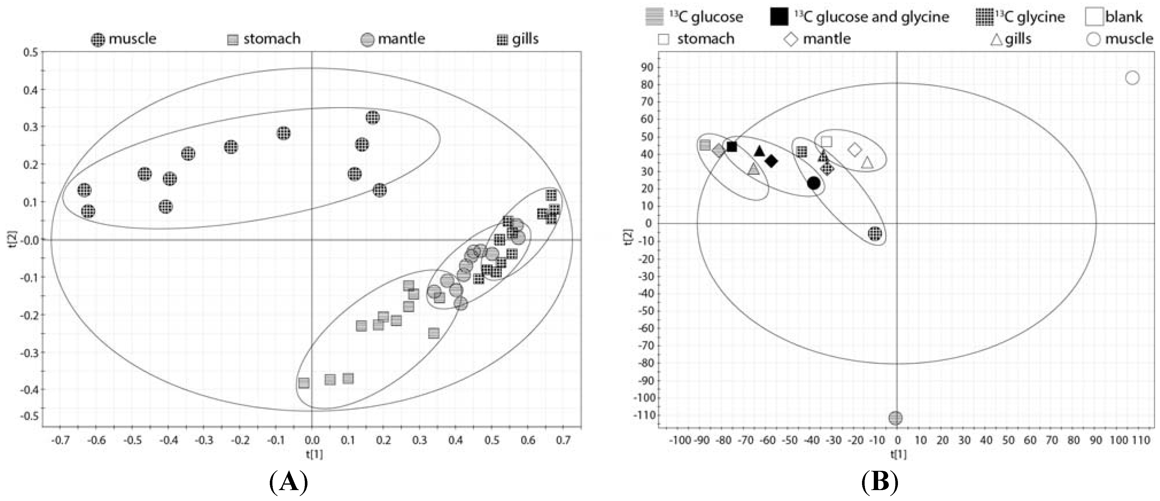(A) The principal component analysis (PCA) of the 14 1H spectra of the four oyster tissue blocks (mantle, gills, digestive gland/stomach, and muscle) treated with just seawater or seawater containing 2.7 mM 2-13C/15N-glycine, 5.5 mM U-13C-glucose, or 2.7 mM 2-13C/15N-glycine plus 5.5 mM U-13C-glucose; (B) The PCA plot of the 13C spectra of the four oyster tissue blocks from oyster exposed to the three treatments as in (A). Both 2.7 mM 2-13C/15N-glycine plus 5.5 mM U-13C-glucose is situated between the 2.7 mM 2-13C/15N-glycine (right) and 5.5 mM U-13C-glucose (left), indicating that the parent and metabolites are contributing to this separation.