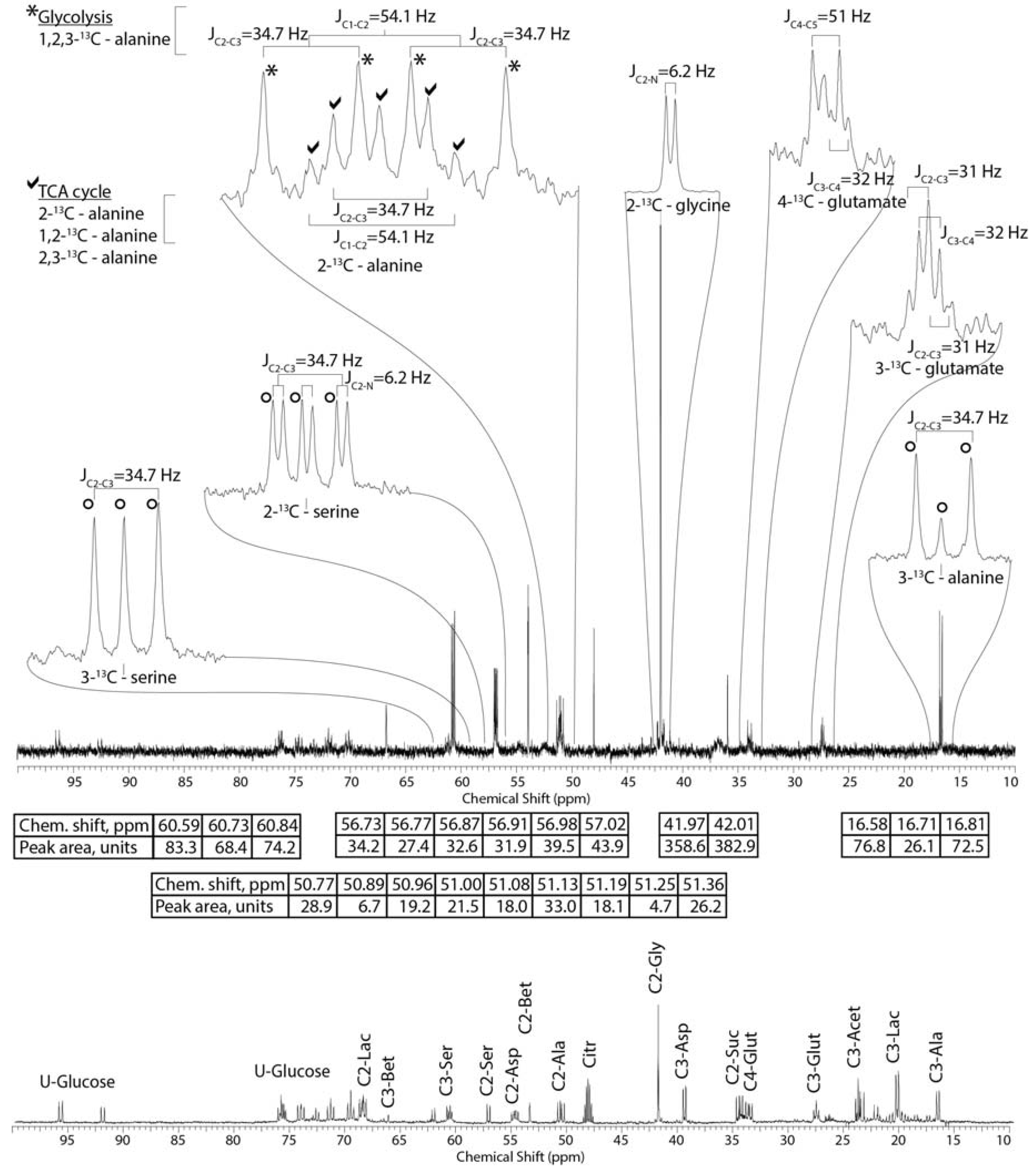 Representative 13C NMR spectra of methanol extract of mantle from oysters after 48 h of exposure to 2.7 mM 2-13C/15N-glycine and 5.5 mM U-13C-glucose in seawater. Inset spectral enlargements show the various coupling constants derived from the spectrum. Given in the tables below the spectrum are the respective chemical shifts and carbon-carbon coupling constants (Jcc) of the various 13C isotopomers and associated peak areas. The 13C spectrum at the bottom of the figure identifies all 13C-labeled metabolites detected in this study, and is from the crushed oyster experiment discussed in the text.