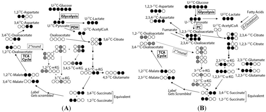 The metabolic scrambling of U-13C-glucose entering the Krebs cycle via pyruvate dehydrogenase (A) and pyruvate carboxylase (B) showing the pathway by which various isotopomers form. The 13C scrambling of labeled U-13C-pyruvate entering the Krebs cycle shows that the 1,2,3-13C-glutamate and 1,2,3-13C-aspartate isotopomers only form by entry into the Krebs cycle via pyruvate carboxylase, while 4,5-13C-glutamate and 3,4-13C-aspartate forms via pyruvate dehydrogenase.