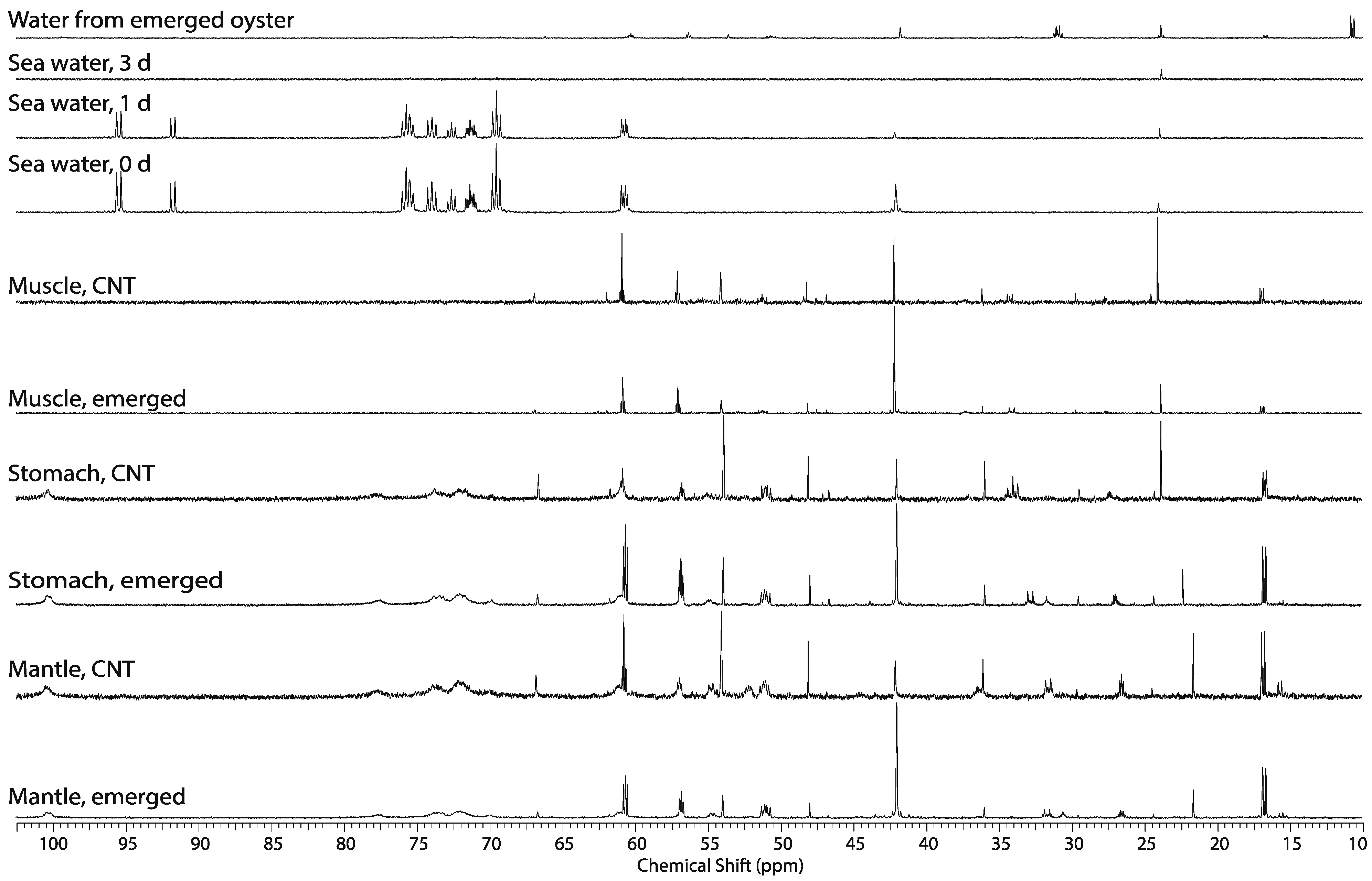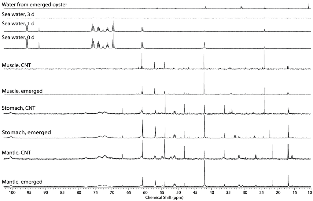Lyophilized powder from the perchloric acid extraction for each of the organ blocks for each oyster was dissolved in 0.7 mL deuterium oxide with 0.2% TSP and transferred to a 5 mm NMR tube. The 1H NMR spectra were acquired at 25 °C using a 14.1 T Varian Inova spectrometer equipped with a 5 mm HCN NMR probe with a one-pulse sequence using a 90° flip angle, with a 1.5 s presaturation pulse on residual water, a 2.5 s acquisition time and 1.5 s relaxation time resulting in a 4 s repetition time. The sweep width was 6,000 Hz and acquired with 15,000 complex points, and 128 transients. The 13C NMR spectra were acquired at 25 °C using a 14.1 T Varian Inova spectrometer equipped with a 5 mm broadband NMR probe with a one-pulse sequence with WALTZ decoupling during acquisition, a 2 s acquisition time and 2 s relaxation time resulting in 4 s repetition time. The sweep width was 32,000 Hz and acquired with 64,000 complex points. For the WoMBaP studies there were 512 transients and for the emergence studies there were 1,024 transients.