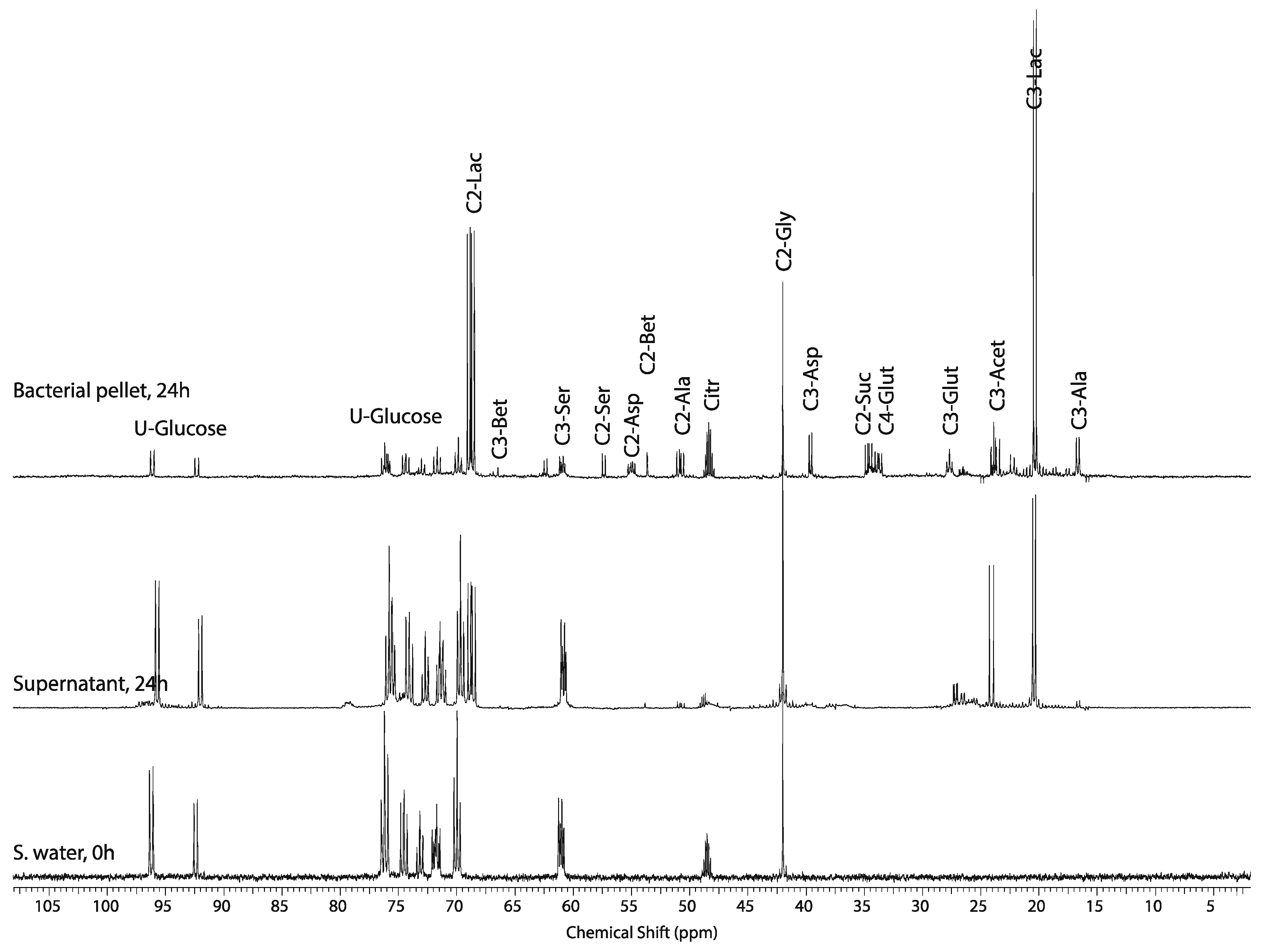Representative 13C NMR spectra of the seawater from this incubation at the beginning of the experiment (bottom spectrum), and seawater supernatant (middle spectrum) and extracted pellet containing the oyster carcass (top spectrum) after centrifugation and 24 h, of incubation at room temperature. This study demonstrates the metabolism of 2-13C-glycine and U-13C-glucose by endemic bacteria creates significant levels of anaerobic glycolytic end-product, lactate (21 ppm), and additional metabolites (see text).