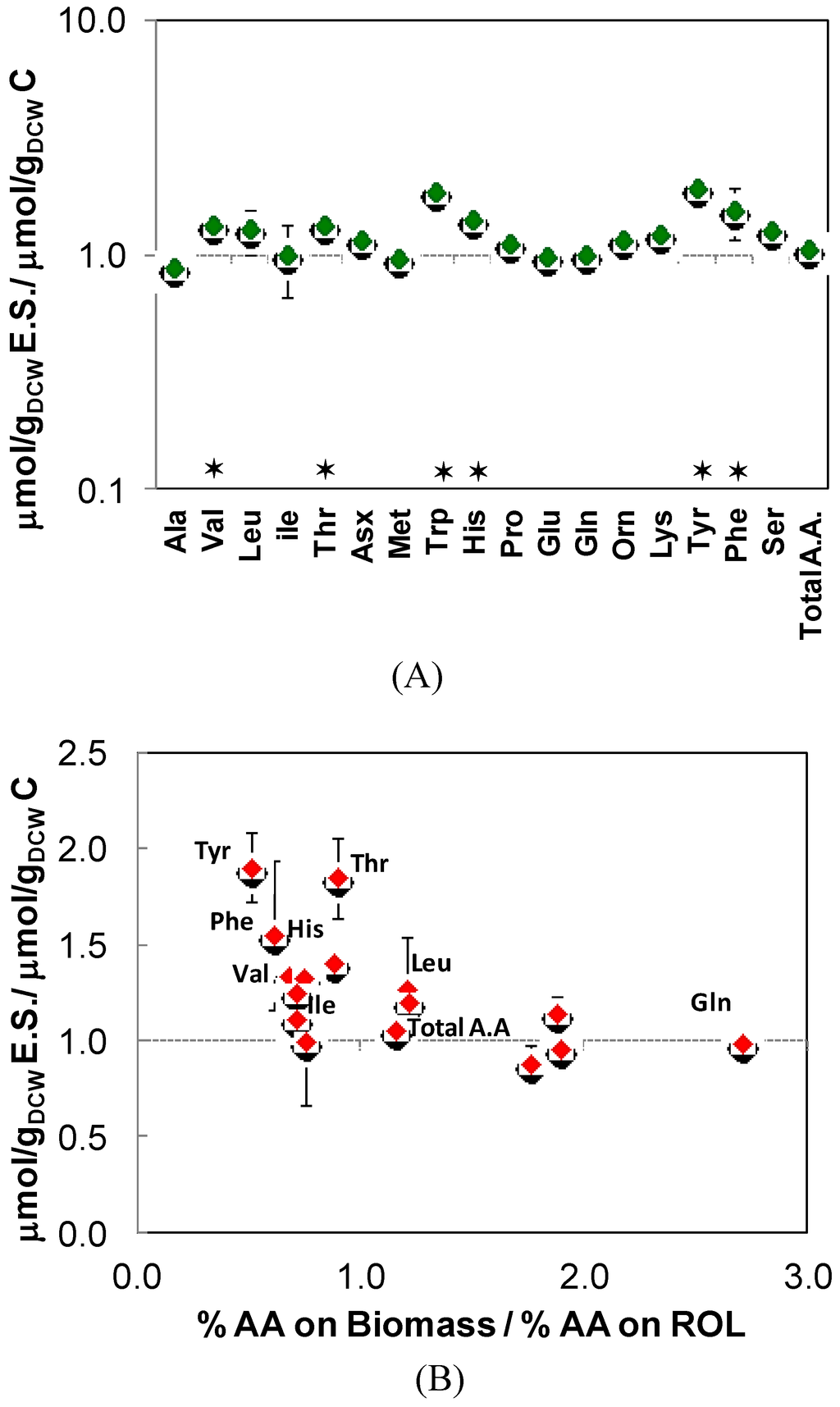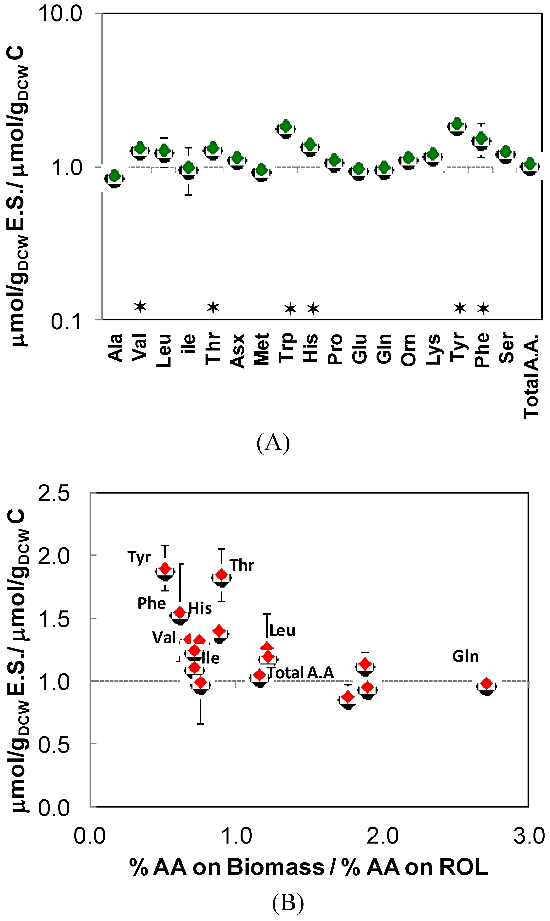 Hence, there was no apparent correlation between differences in amino acid pool sizes (Figure 1A) and those in cell protein amino acid composition between the two strains. This general trend has also been observed when a Fab fragment is expressed in P. pastoris cells grown aerobically on glucose as a sole carbon source [34].