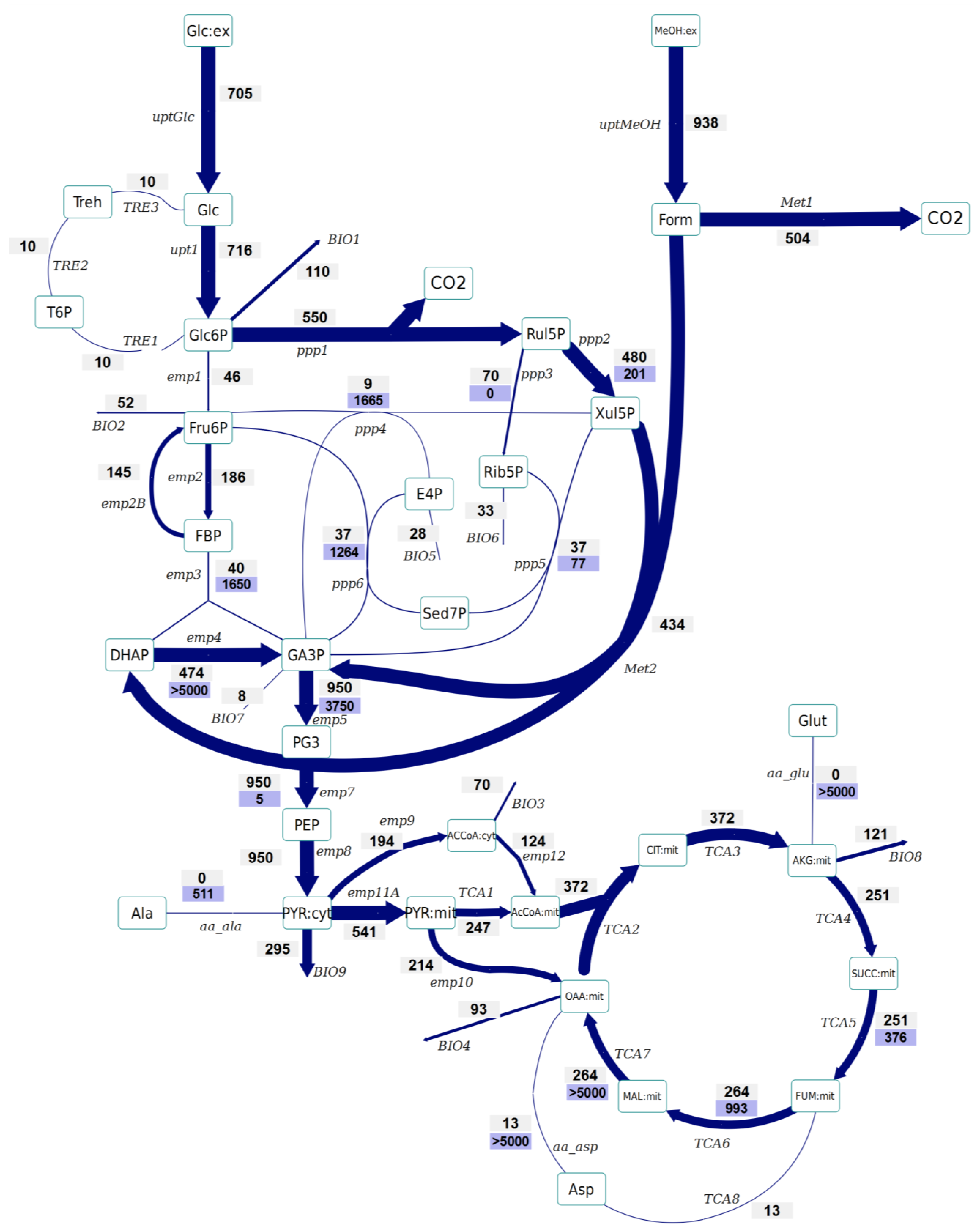 Recently, Jordà and co-workers [25] applied transient 13C metabolic flux analysis to analyze P. pastoris growing on glucose/methanol mixtures. The study lead to an extended network topology and a better quantitative characterization of methanol metabolism and related pathways, compared to earlier studies based on 13C-labelling of proteinogenic amino acids [18].