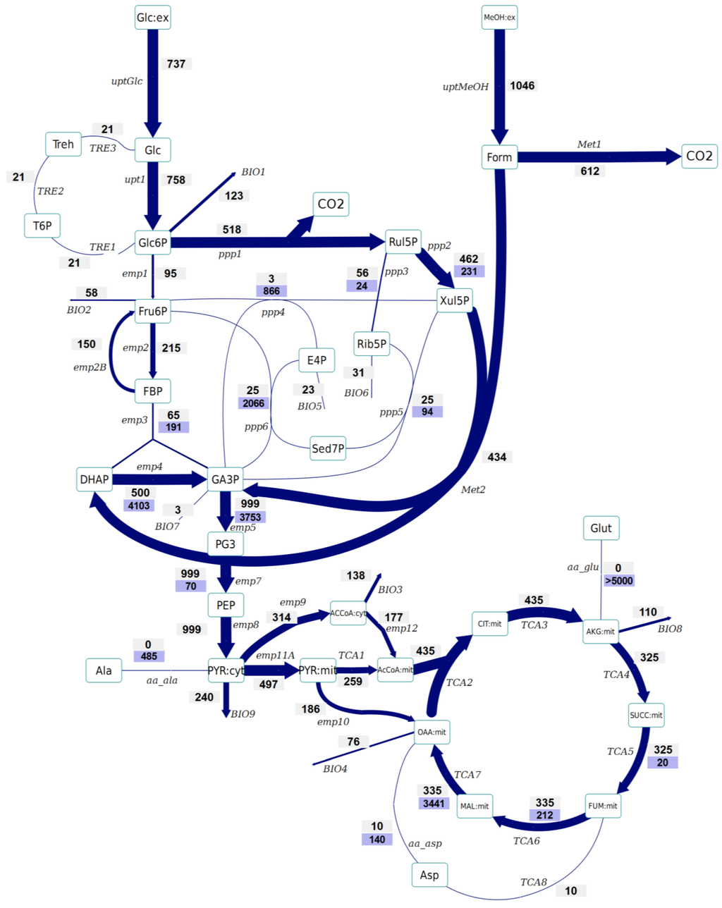 Figure 2. Metabolic flux distributions of the control strain based on INST-13C-MFA. The flux values are given in μmol/gDCW/h. The width of the arrow represents the flux value. The upper values represent the net flux (in direction of the arrow), whereas the lower values (on blue background) reflect the backward flux (absolute). All the fluxes are also listed in Supplementary File 3.