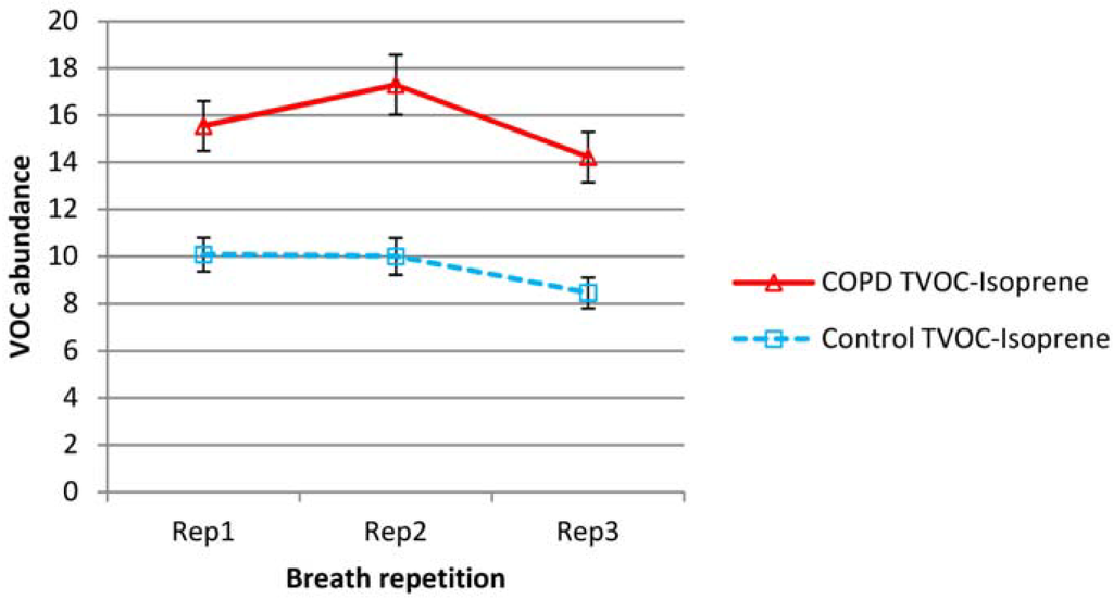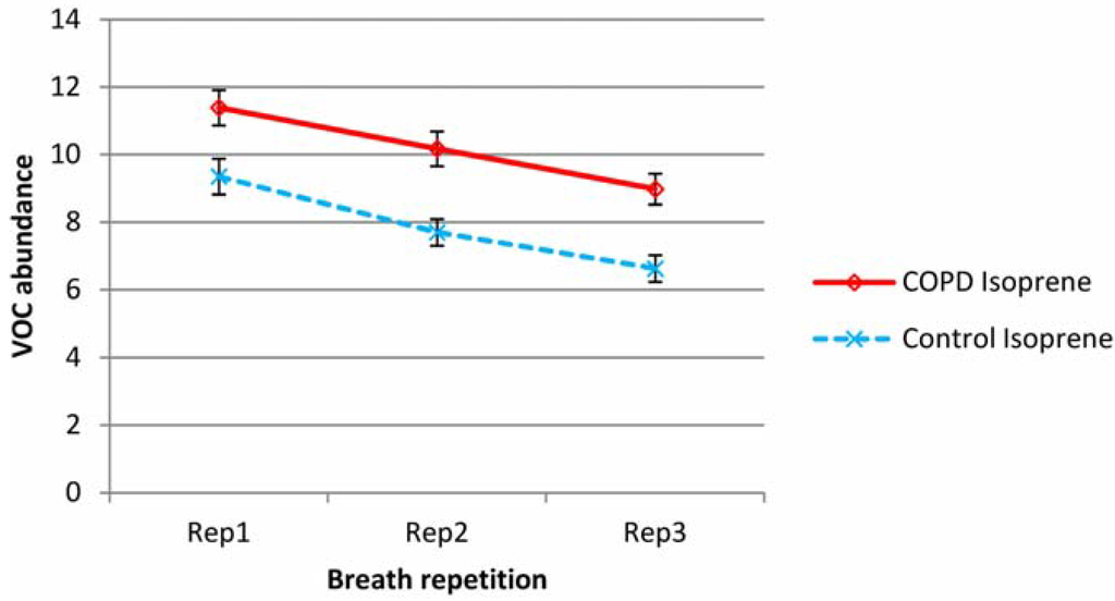 Isoprene was a substantial element of breath VOC and was present in higher levels in the breath of COPD patients than controls. In both COPD and control groups, exhaled isoprene levels fell steadily upon repeat testing. Proportionally, this drop was higher in healthy subjects. Total VOC minus isoprene, was also higher in the COPD group but showed a different pattern; for the COPD group there was increased abundance in the second sample and then a reduction on the third sample to levels below that of the first breath. For the control group, there was little difference between breath 1 and 2, but there was a decline in breath 3.