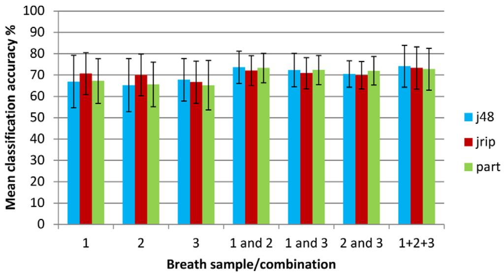 For the individual breath sample datasets, the mean classification accuracy for the different methods was similar and ranged from 66.5% to 68.3% with no statistical difference between the different breaths. An optimum accuracy of 70.7% was obtained using the JRIP classifier for breath 1. This difference is statistically significant when compared with J48 and PART classifiers. The same is true for the result for breath 2. Classification accuracy was improved by combining breath samples into datasets. Combining two of the breath samples in various combinations (1&2, 1&3 and 2&3) gave mean accuracies between 70.8% and 73.0%, with an optimum (but statistically equivalent) accuracy of 73.7% achieved using breaths 1&2 with the J48 classifier. It is known that J48 is an optimistic classifier [27], and indeed this is reflected in the high standard deviation of the classification accuracies when compared with other learners. This is also supported by the outcome of the significance test which shows that although the absolute classification accuracies for J48 are higher, the gains are not statistically significant. When breaths 1, 2 and 3 were summed, the mean classification accuracy for the different methods was 73.4%, with an optimum accuracy of 74.1% achieved again with the J48 classifier learner. The standard deviation for the accuracies was noticeably lower when data from two breaths were combined into single data sets; though, this was less significant when all breaths were summed. Overall, the JRIP classifier was most consistent. The J48 classifier tended to the most unstable, with highest standard deviations relative to the mean. This was particularly true for individual breaths where there were fewer objects to learn from. However, for the combined datasets there was little to separate the three different learners.