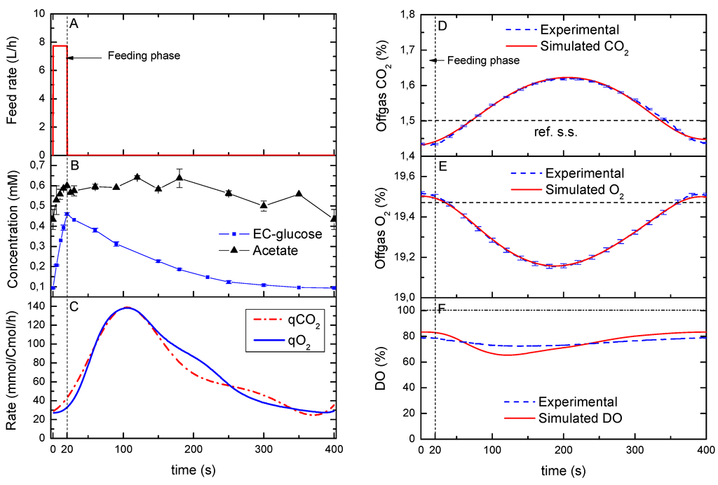 (A) Feeding rate during one cycle; (B) Measured extracellular concentration of glucose (EC-glucose, squares) and acetate (triangles), error bars represent the standard error of duplicate determination during two subsequent cycles. (C) Model-based estimation of the qO2 and qCO2; (D–F) Dynamics of the on-line measurements (off-gas CO2 and O2; DO, dissolved oxygen) during one cycle in comparison to the model simulation (using the rates in C). The horizontal dashed line in D and E represents the reference steady state. The vertical dotted line represents the end of the feeding phase.