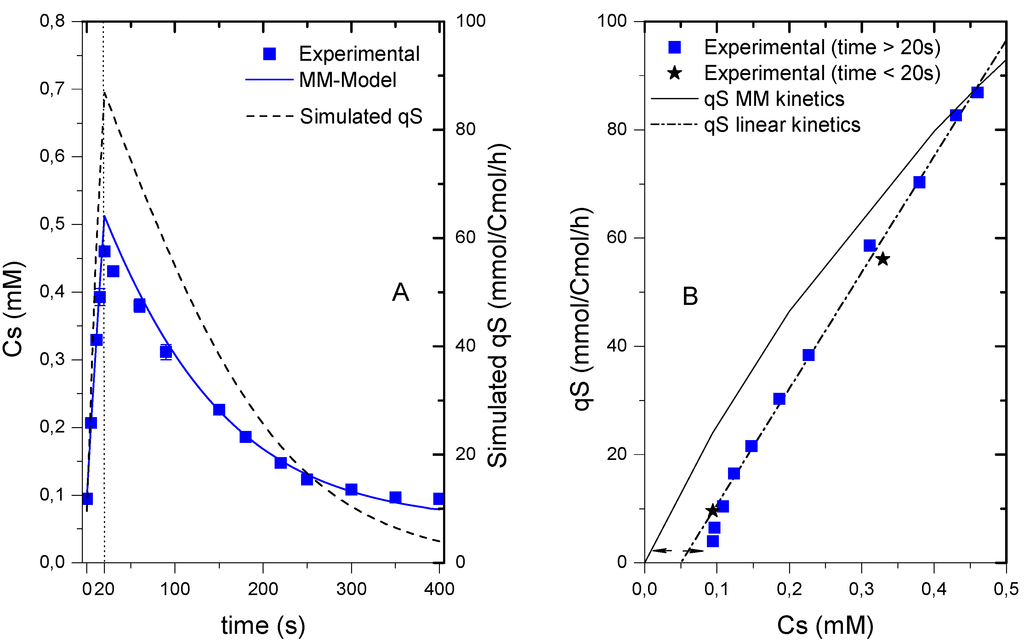 Dynamics of the residual glucose concentration and uptake rate during the cycle. (A) Measured extracellular glucose concentration (Cs, closed squares) and Simulated extracellular glucose concentration (solid line) using a MM model (Km = 1mM, qS,max = 279 mmolCmol−1h−1); Dynamics of the specific uptake rate (qS) in time (dashed line); (B) Comparison of the experimental qS (from interpolation) as a function of CS (extracellular glucose concentration) to a hyperbolic function (solid line) and a linear function (dot-dashed line). The vertical dotted line represents the end of the feeding phase.