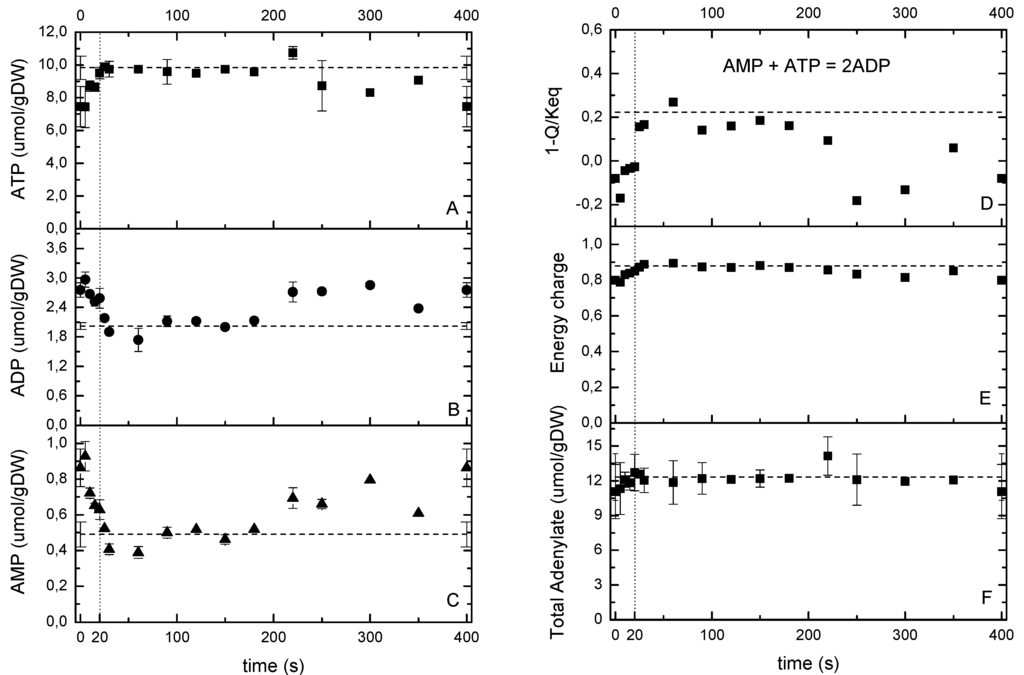 (A–C) ATP, ADP and AMP measurements during the cycle. (D) Thermodynamic driving force for adenylate kinase. (E) energy charge and (F) total adenylate pool over the cycle (right). The dashed line represents the reference measurement during the chemostat phase (D = 0.1 h−1), error bars represent the standard error of duplicate determination during two subsequent cycles. The vertical dotted line represents the end of the feeding phase.