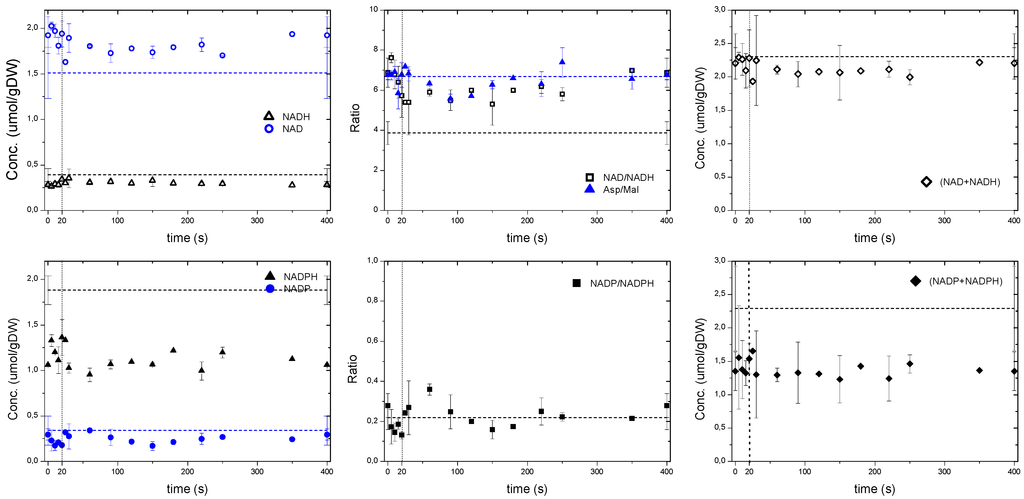 Whole cell measurements of NAD, NADH, NADP, NADPH as well as ratios based on sensor reactions. The dashed line represents the reference measurement during the chemostat phase (D = 0.1 h−1), error bars represent the standard error of duplicate determination during two subsequent cycles. The vertical dotted line represents the end of the feeding phase