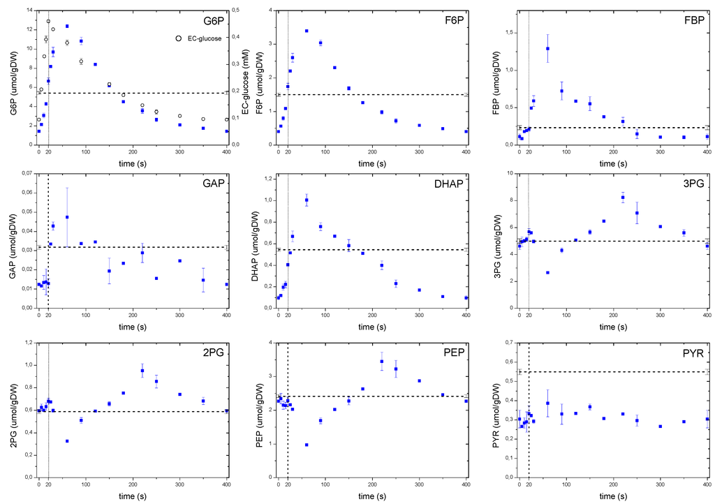 A remarkable dynamic behavior was observed with 3PG,2PG, PEP and to a certain extent with pyruvate. Whereas 3PG and 2PG showed a modest increase during the first 20 s of the cycle, PEP decreased for about 60 s, which corresponded to the concentration maximum observed for FBP. Although this behavior can be explained by an activation of the pyruvate kinase reaction [6], the metabolites of the lower glycolysis began to accumulate 60 s after the pulse, most likely following the falling pattern of FBP. Interestingly, from about 220 s onwards their concentrations decreased again, even though the FBP concentration was already at low levels. The observed behavior suggests that at metabolite level, there may still be unknown regulatory mechanisms controlling the dynamic response of the lower glycolysis and so, the carbon flux. Pyruvate concentration showed an almost constant concentration and about half of the steady-state value. This apparent absence of dynamics could be due to compartmentalization or a buffer capacity of the closely related amino acid alanine, which had a concentration about 100 times higher than pyruvate.