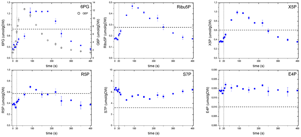 In the case of the pentose phosphate pathway (Figure 6), concentrations of the non-oxidative branch, with the exception of S7P and E4P, suggested a strong correlation with the upper glycolysis following the behavior of F6P. In the oxidative branch, although 6PG showed a behavior that followed its precursor G6P (open circles), there was a more notorious shift in the time for the maximum concentration to be reached (about 90 s) compared to G6P. In addition, the 6PG concentration remained high until 180 s, whereas G6P immediately dropped after its peak. Theobald et al. [6] observed a similar behavior in 6PG after a glucose pulse, interpreting this response as a delay that most likely followed a mechanism to keep FBP and GAP concentrations at high levels, e.g., the glycolytic flux increased faster than in the PPP.