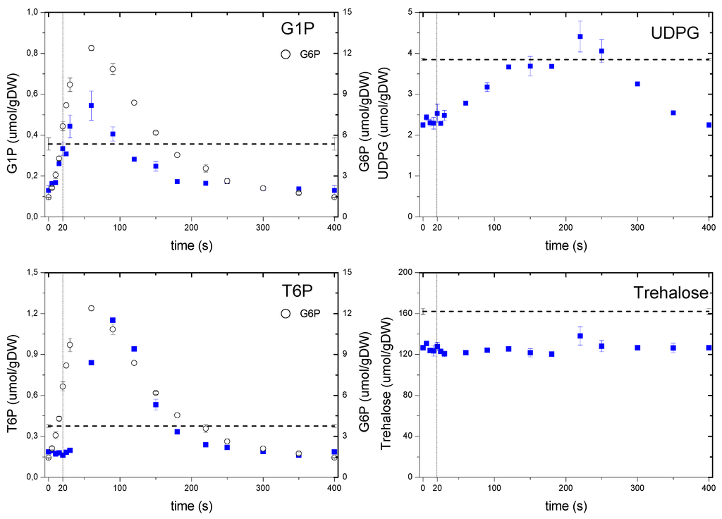 Another example of a regulation that is not based on allosteric effects is observed with UDPG that showed a clear delayed dynamics and did not follow its precursor G1P. In particular, there was a delay during the first 20 s of the cycle and the maximum concentration was only reached after 160 s. This delay clearly points to the involvement of a post translational modification (PTM) mechanism. UDPG is reported to be a key metabolite not only in the synthesis of trehalose [34] but also in the metabolism of glycogen, cell-wall synthesis and protein N-glycosylation [37], therefore, the dynamics of UDPG will influence these processes.