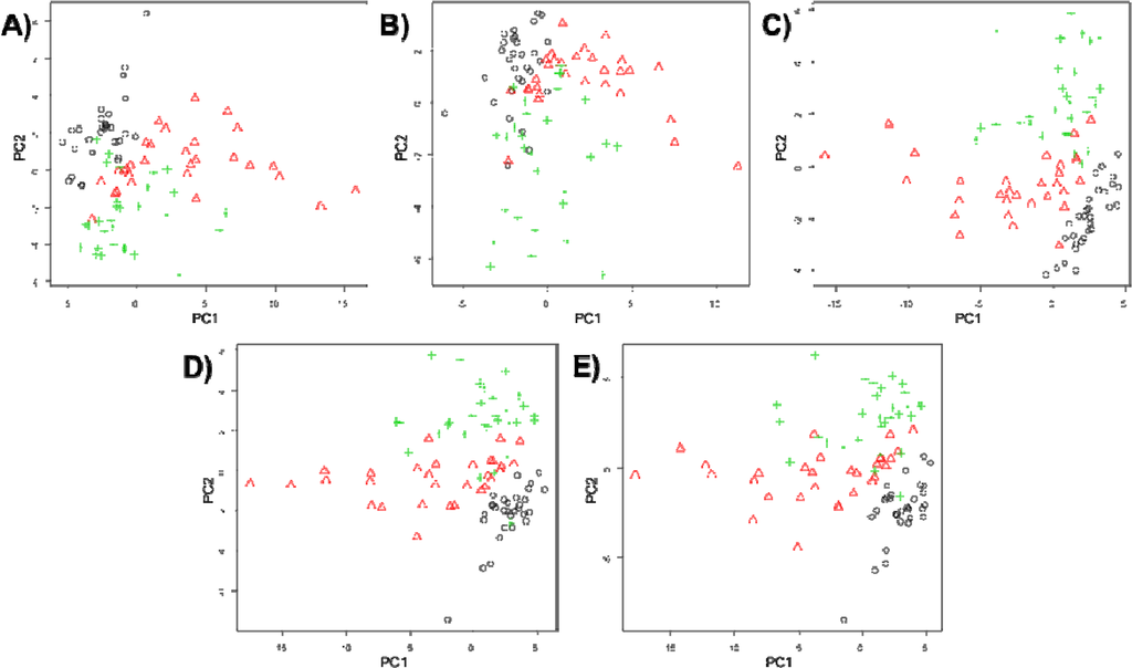 PCA scores plots showing comparisons of five different missing value substitutes on for: (A) zero; (B) mean; (C) median; (D) kNN; and (E) RF. Symbols represent: normoxia (black circles), hypoxia (red triangles) and anoxia (green pluses).