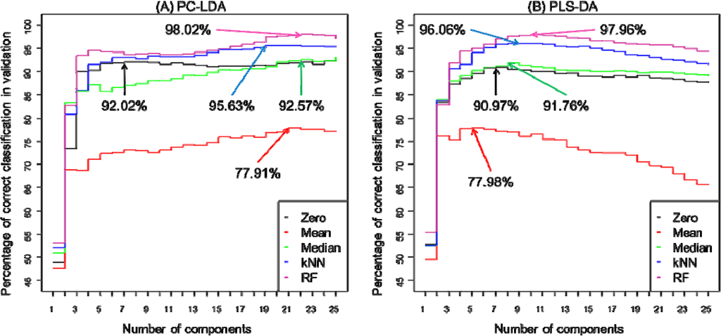 As described above bootstrapping was used to construct 100 different PC-LDA or PLS-DA models and inspection of these allows one to predict how accurate classification is. For PC-LDA this is in terms of recovery of test data with appropriate training data in LDA scores space, whilst for PLS-DA the Y predicted matrix is inspected and the binary encoding in this PLS2 model used. That is to say the encoding for normoxia is 100, hypoxia is 010 and for anoxia the output would be 001. Figure 4 highlights how the different replacement approaches can have an impact on the average correct classification rates of the 100 models for PC-LDA (Figure 4A) and for PLS-DA (Figure 4B) and also shows the effect of the number of components used on this classification accuracy. To aid interpretation this plot is annotated with the points at which the highest classification occurs. For PC-LDA the preferred model is the one with RF imputation demonstrated an excellent classification rate of 98.02% with 22 latent variables. In addition, this method performed the best along all components in comparison to other replacement techniques. Second best result of 95.63% classification rate was recorded for kNN. Zero imputation as whilst this is slightly lower (92.02%) than the median imputation (92.57%), however fewer latent variables are used, 7 compared with 22 PCs. Whilst for PLS-DA both zero and median imputation give very similar predictive abilities (90.97% vs. 91.76%) and use a very similar number of latent variables (7 vs. 8). In terms of best performance for PLS-DA yet again RF (97.96%) and kNN (96.06%) accomplished the best in comparison to other methods; however the difference between both is smaller as for PC-LDA. What is clear from both PC-LDA and PLS-DA is that mean imputation (Figure 4) is significantly worse and predictions are only ~78%. However, these differences in classification rates are very small as it could be expected as these both methods should display similar results as reported in the literature [7,58,66].