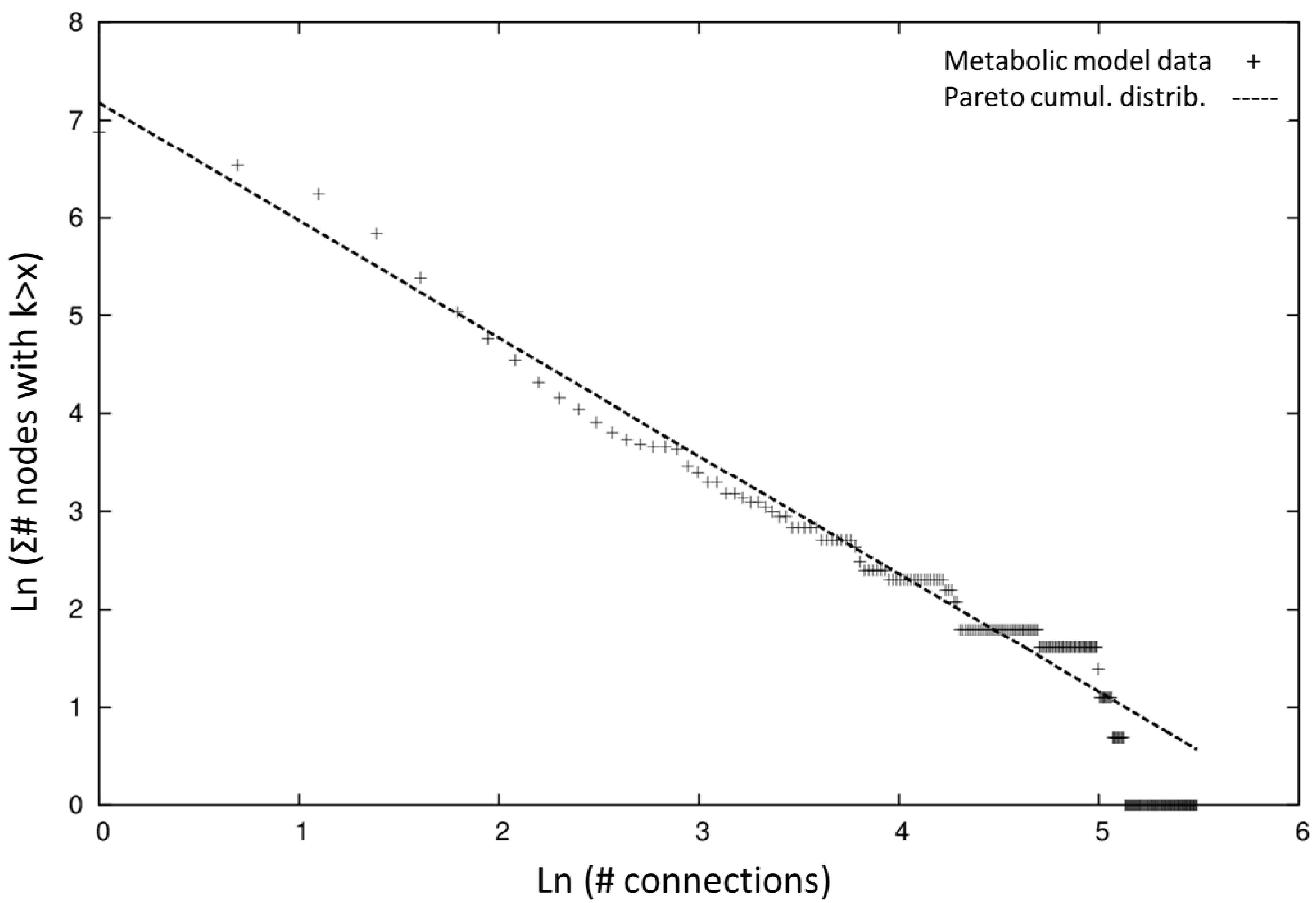 From the topological perspective the characteristics of the model are very similar to other published organisms’ providing support for an evolutionary study of the structure and organizational properties of metabolic networks, in the line of recent works [66]. The connectivity analysis of the network model using the Pareto cumulative distribution shows scale-free behavior with a high non-uniformity and a hierarchical connectivity of the metabolites, which is typical of biological networks and points towards functional properties discussed in other works [46].