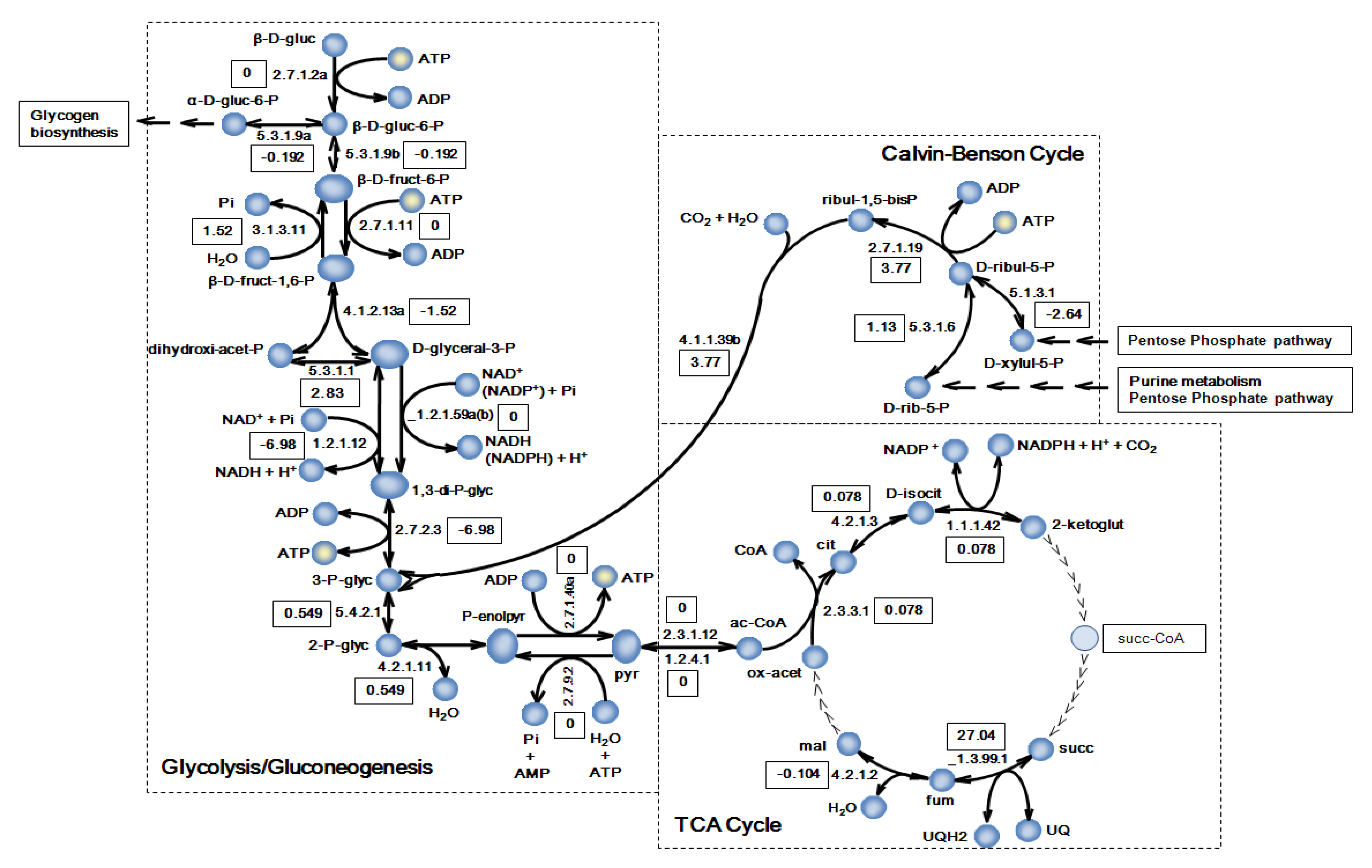 The final model includes central metabolic pathways, such as the glycolysis/gluconeogenesis pathway, the Calvin-Benson cycle, the pentose phosphate pathway, incomplete reactions within the tricarboxylic acid cycle (TCA), as well as the complete set of anabolic pathways involved in the biosynthesis of chlorophyll, glycogen, amino acids, lipids, nucleotides, vitamins, cofactors, etc. Pathways for glyoxylate synthesis (via ribulose-1, 5-bisphosphate carboxylase/oxygenase and the shunt across TCA cycle), and amino sugars metabolism are also included.
