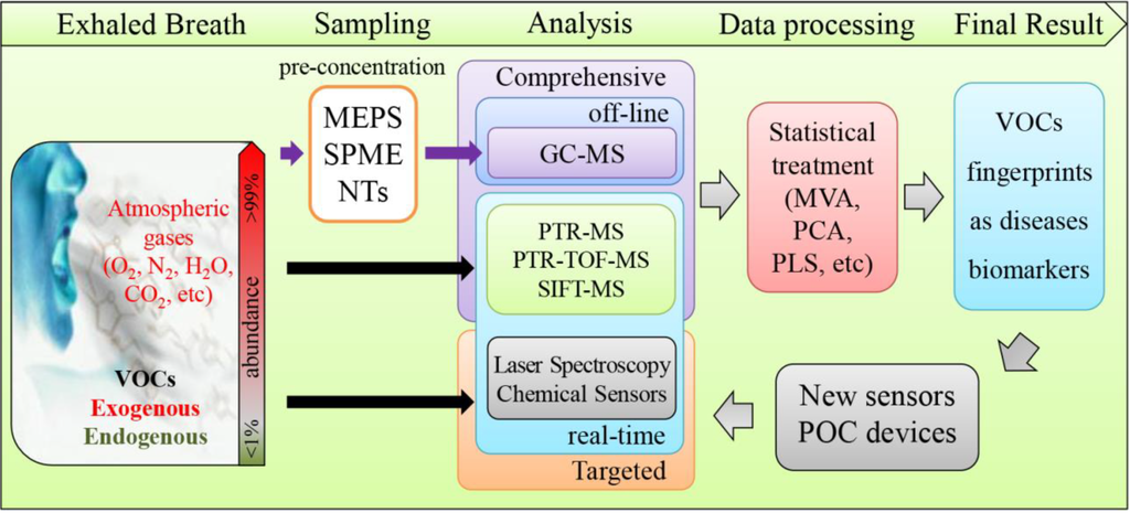 Generic layout for exhaled breath (EB) analysis. Abbreviations used: GC—gas chromatography, MEPS—microextraction by packed sorbent, POC—point of care, PTR-MS—proton transfer reaction with mass spectrometry, PTR-TOF-MS—proton transfer reaction with time-of-flight mass spectrometry, SIFT-MS—Selected ion flow tube mass spectrometry, NTDs—Needle Trap Devices, MVA—multivariated analysis, PCA—Principal Component Analysis, PLS—Partial least-square, VOCs—volatile organic compounds