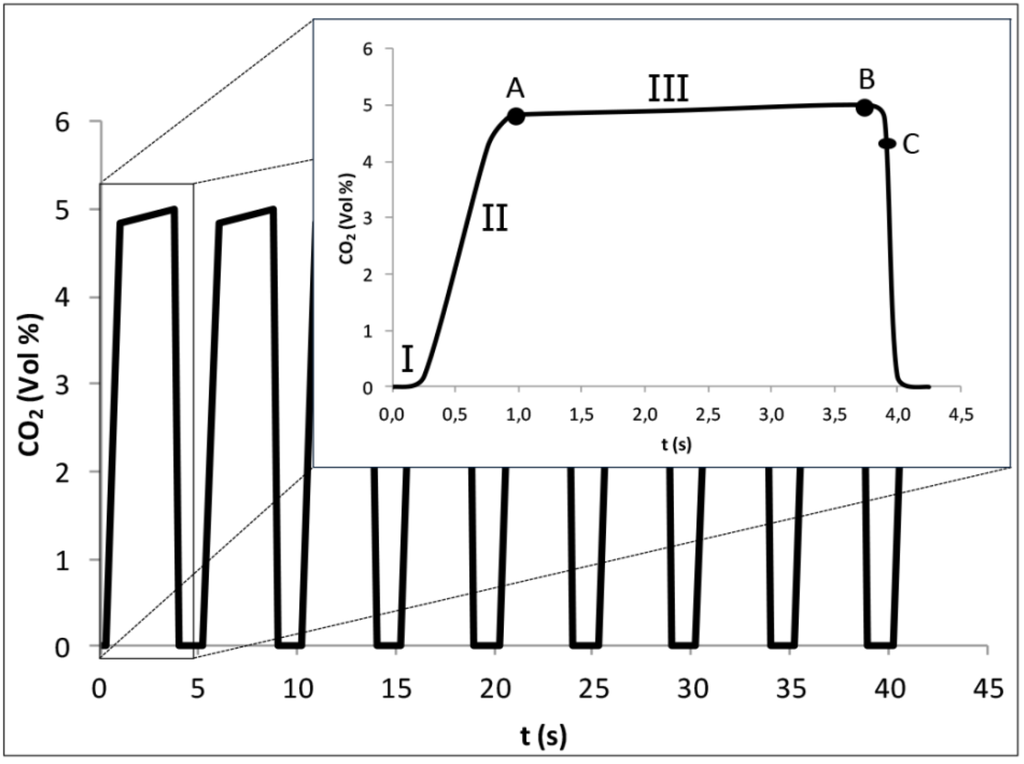 Exhaled CO2 monitoring by normal Capnograph: (A)—initial of alveolar sampling; (B)—final of alveolar sampling; (C)—final of exhalation. Differentiation phases of breathing: (I)-inspiratory phase; (II)-mixing phase; (III)-alveolar phase (adapted from [34,35]).
