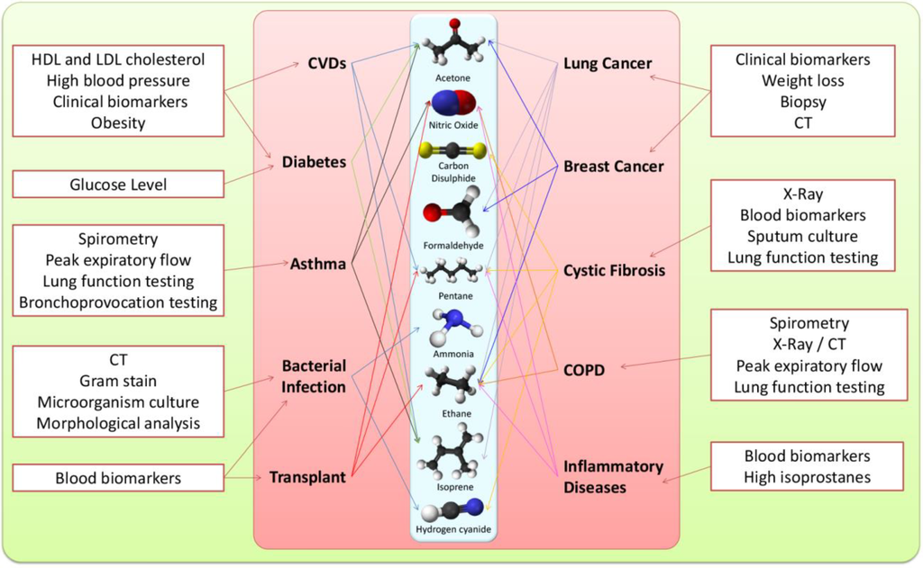 Non-communicable diseases, such as cardiovascular (CVDs), oncologic (ODs), neurodegenerative (NDDs), and chronic respiratory diseases, are the major causes of death in the developed countries [1]. They are also becoming highly prevalent in the developing countries due to changing lifestyles. It is estimated that by the year 2020, seven out of 10 deaths in developing countries and 80% of the global disease burden would be caused by non-communicable diseases [1]. For example, Diabetes is a major concern for the developing countries, as its incidence is projected to triplicate from 84 to 228 million cases during 2000–2030 period [2]. Taking together with the high incidence of infectious diseases, such as AIDS, malaria and different haemorrhagic viral infections, there is a double disease burden on developing countries [3]. There are two key contributing factors for this highly negative prognosis. They are: (a) Late diagnosis, usually performed using invasive and expensive procedures, when the diseases have already reached a life-threatening stage and (b) the critical lack of medical and laboratorial infrastructures [4]. Hence, there is an urgent need for development of new efficient diagnosis tools, particularly, those which reliably detect diseases at their early stages. Such technologies have to be cheap, reliable, rugged and portable, otherwise they may not be within the reach of most of the people living in the developing countries [3]. From this standpoint breath analysis based disease diagnosis (BADD) looks very promising and attractive. In this review, we focus on BADD discussing on the current trends and innovations from sampling procedure to the final data analysis and diagnosis opportunities. Regarding the EB volatile composition, we discuss the metabolic profiles of the most interesting volatiles and present a few selected examples of putative biomarkers. Finally, we will also discuss the data analysis processes followed in literature and their relevance in the light of the complexity of data generated from EB studies.