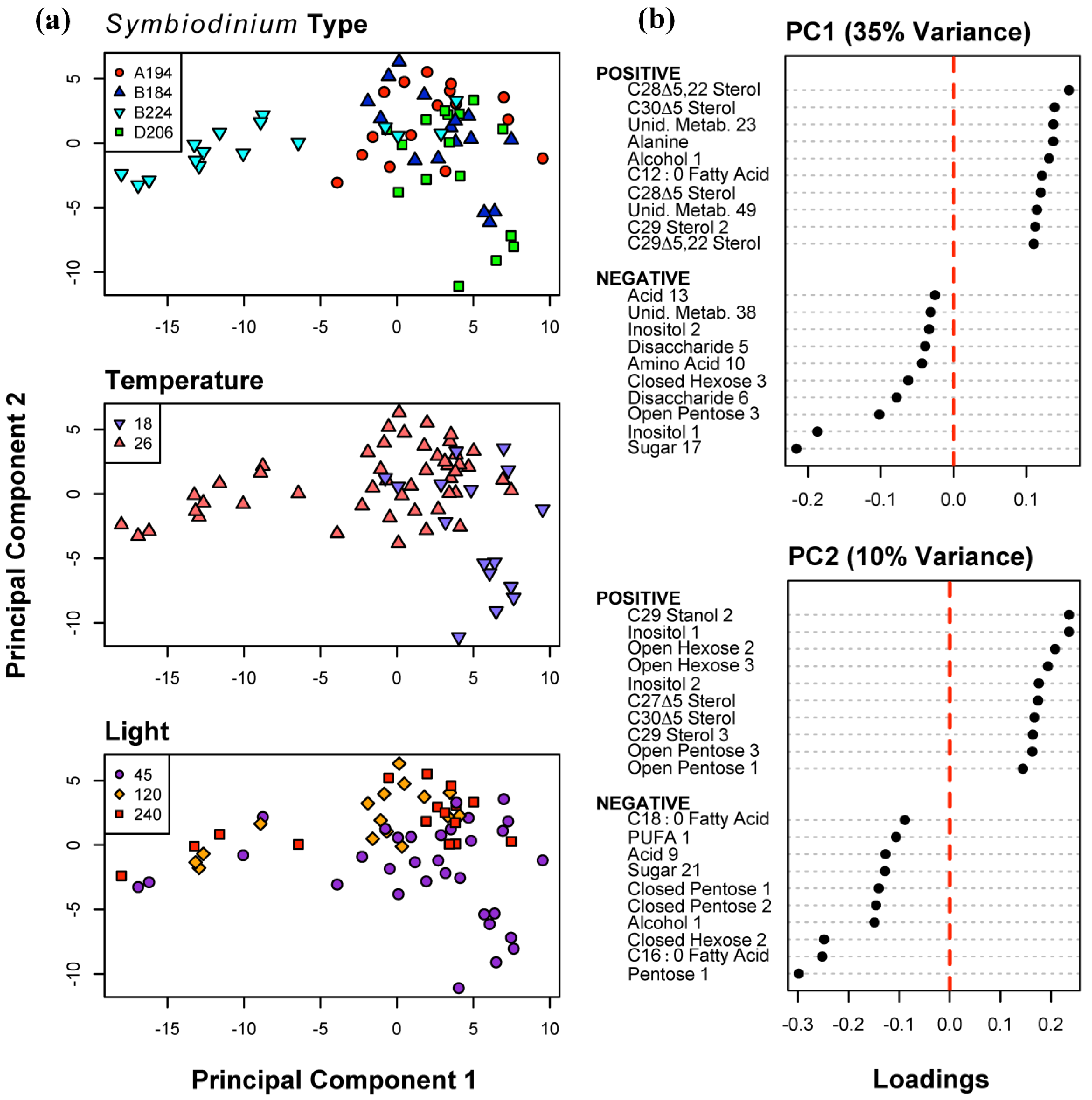 Principal Components Analysis of 155 metabolites for all 64 samples. (a) Distribution of sample scores on Principal Components (PC) 1 and 2, identified to Symbiodinium type, temperature (18 and 26 °C), and light intensity (45, 120 and 240 μmol photons m−20 s−1) algae were cultured at; (b) The ten most positive and negative metabolite loadings on PC 1 and 2.
