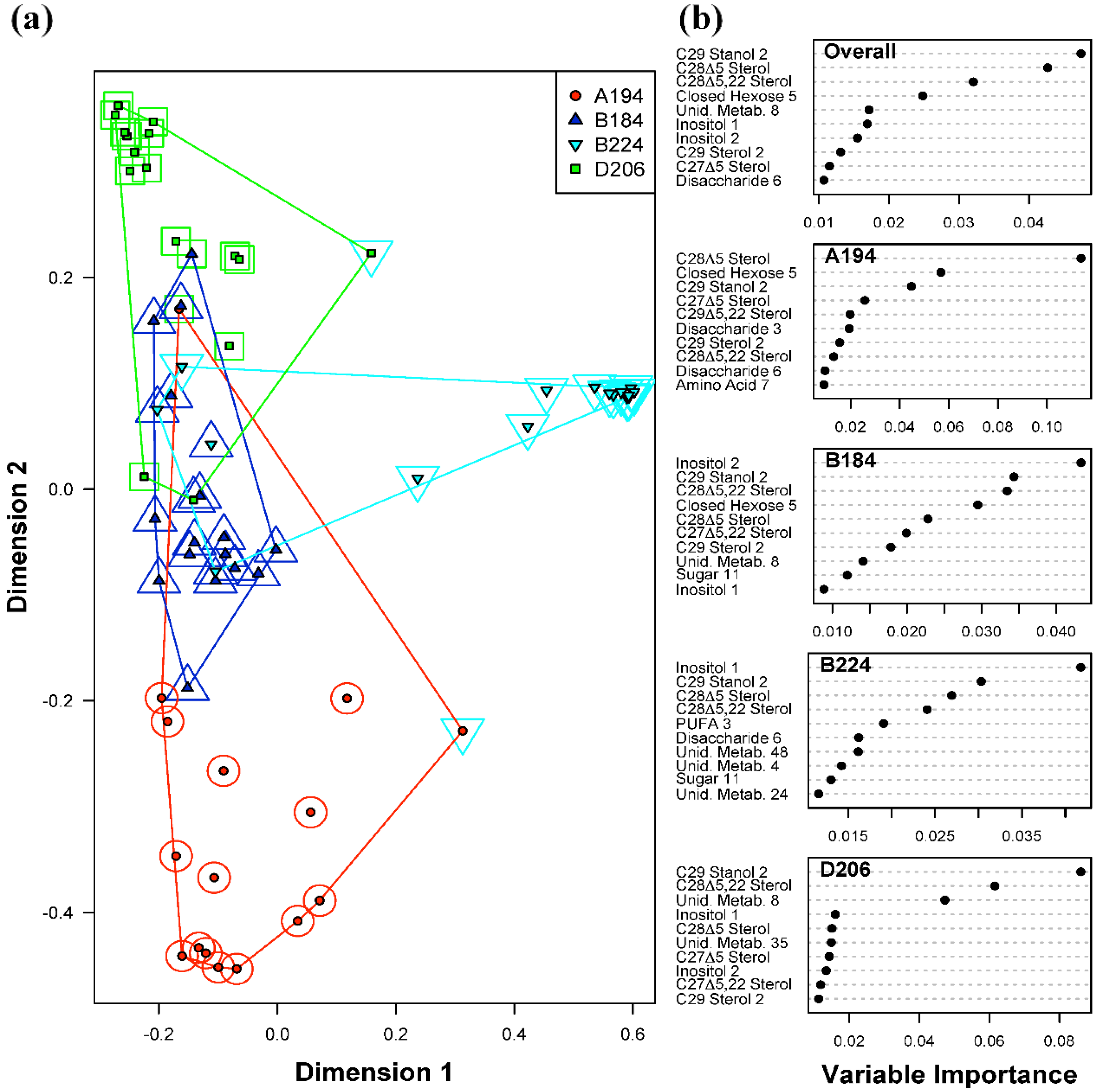 Random Forests classification of Symbiodinium type (A194, B184, B224 and D206). (a) Plot of proximities of all 64 samples from 5000 Random Forests trees as projected on the first two Principal Coordinate dimensions. Color and shape of the central filled points indicate the observed Symbiodinium type of the sample (A194, B184, B224 and D206), while the surrounding color and shape indicate the type predicted by Random Forests. Colored lines are convex hulls linking the outermost points of each type; (b) Distribution of importance scores for the 10 most important predictor metabolites (based on mean decrease in prediction accuracy). Plot labeled “Overall” depicts metabolites found to be important for overall prediction accuracy. Other plots show metabolites important for classifying each particular Symbiodinium type.
