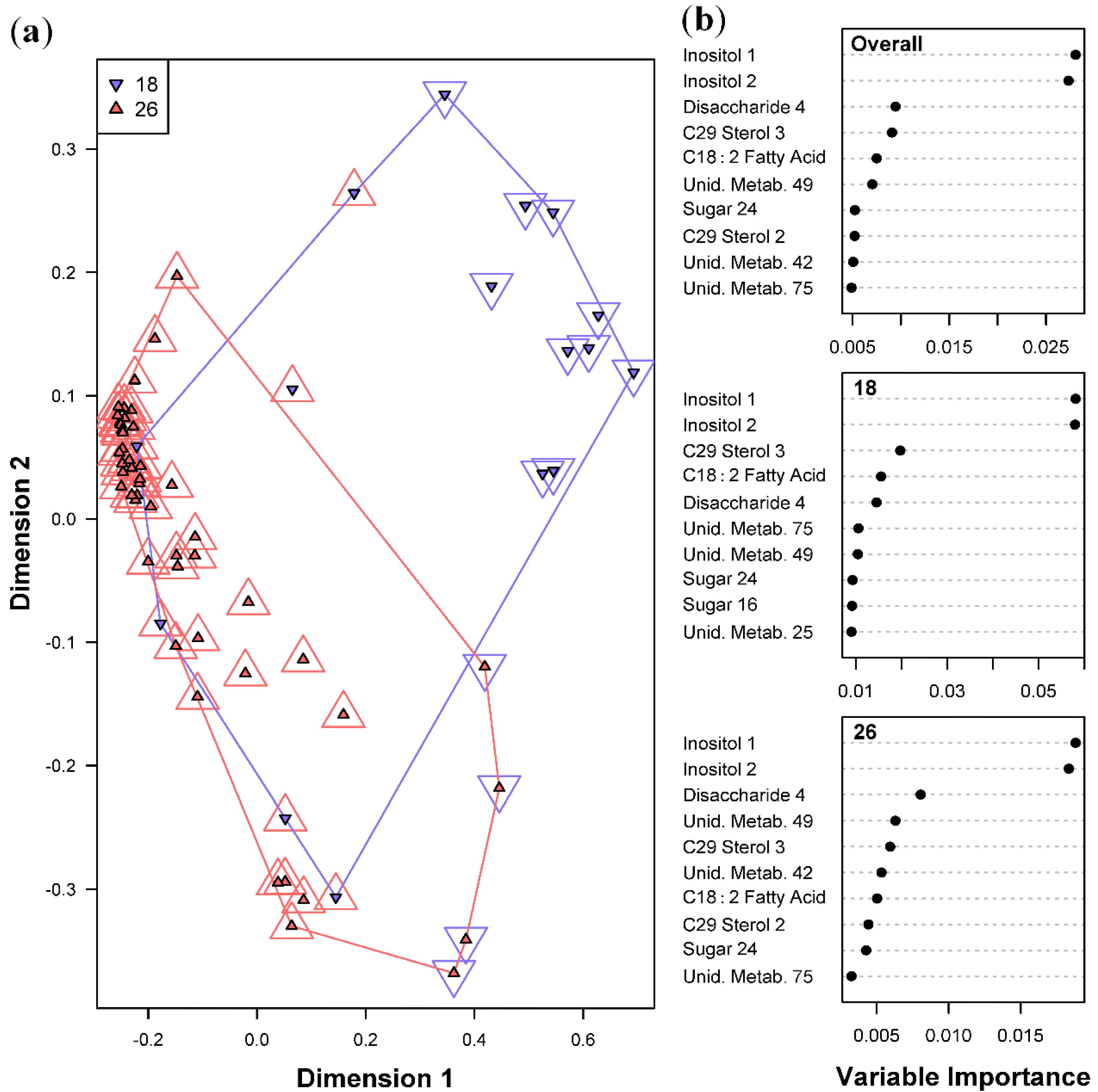 Random Forests classification of temperature (18 and 26 °C). (a) Plot of proximities of all 64 samples from 5000 Random Forests trees as projected on the first two Principal Coordinate dimensions. Color and shape of the central filled points indicate the temperature the sample was cultured in (18 and 26 °C), while the surrounding color and shape indicate the temperature predicted by Random Forests. Colored lines are convex hulls linking the outermost points of each temperature; (b) Distribution of importance scores for the 10 most important predictor metabolites (based on mean decrease in prediction accuracy). Plot labeled “Overall” depicts metabolites found to be important for overall prediction accuracy. Other plots show metabolites important for classifying each temperature.