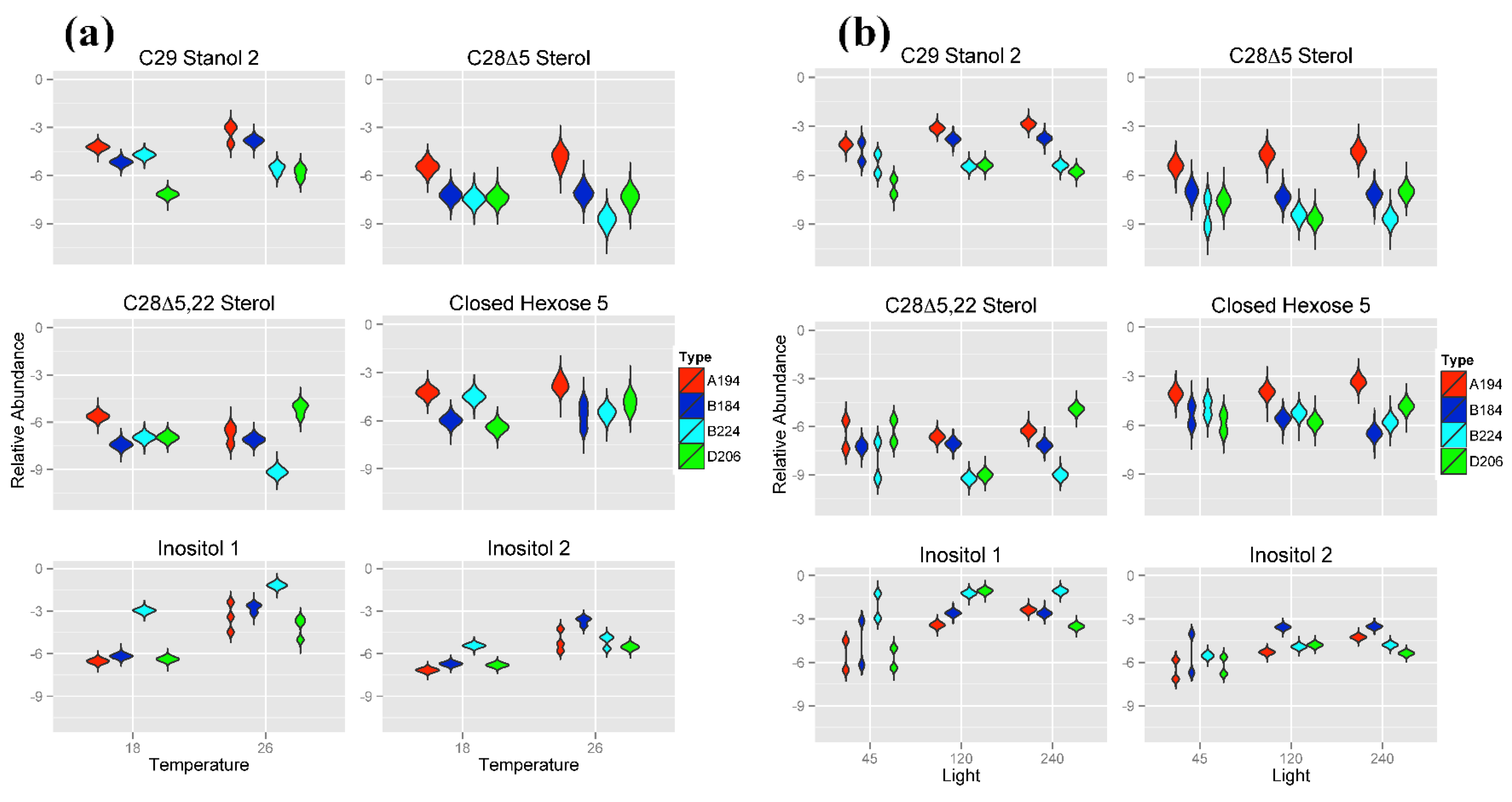 As can be seen from the Random Forests results (Figure 2) and the distributions in Figure 5a,b, Symbiodinium type A194 was primarily characterized by a higher metabolite abundance of two steroidal alcohols (C29 Stanol 2 and sterol C28Δ5 Sterol) as well as higher metabolite abundances of Closed Hexose 5 at each temperature and light intensity. Conversely, Symbiodinium type D206 had a low metabolite abundance of the sterols C29 Stanol 2 and a higher metabolite abundance of C28Δ5.22 Sterol at 26 °C although differentiation from B224 at 18 °C or 120 μmol photons m−20 s−1 was minimal. The two Symbiodinium types of Clade B (B184 and B224) were primarily distinguished by their distributions of the two Inositol compounds wherein B184 had a higher abundance of Inositol 2 at 26 °C and B224 had a higher abundance of Inositol 1 than the other three Symbiodinium types at both temperatures. Metabolite abundance values for the sterols C29 Stanol 2, C28Δ5 and C28Δ5.22 at 26 °C tended to be greater in Symbiodinium type B184 than they are in type B224.