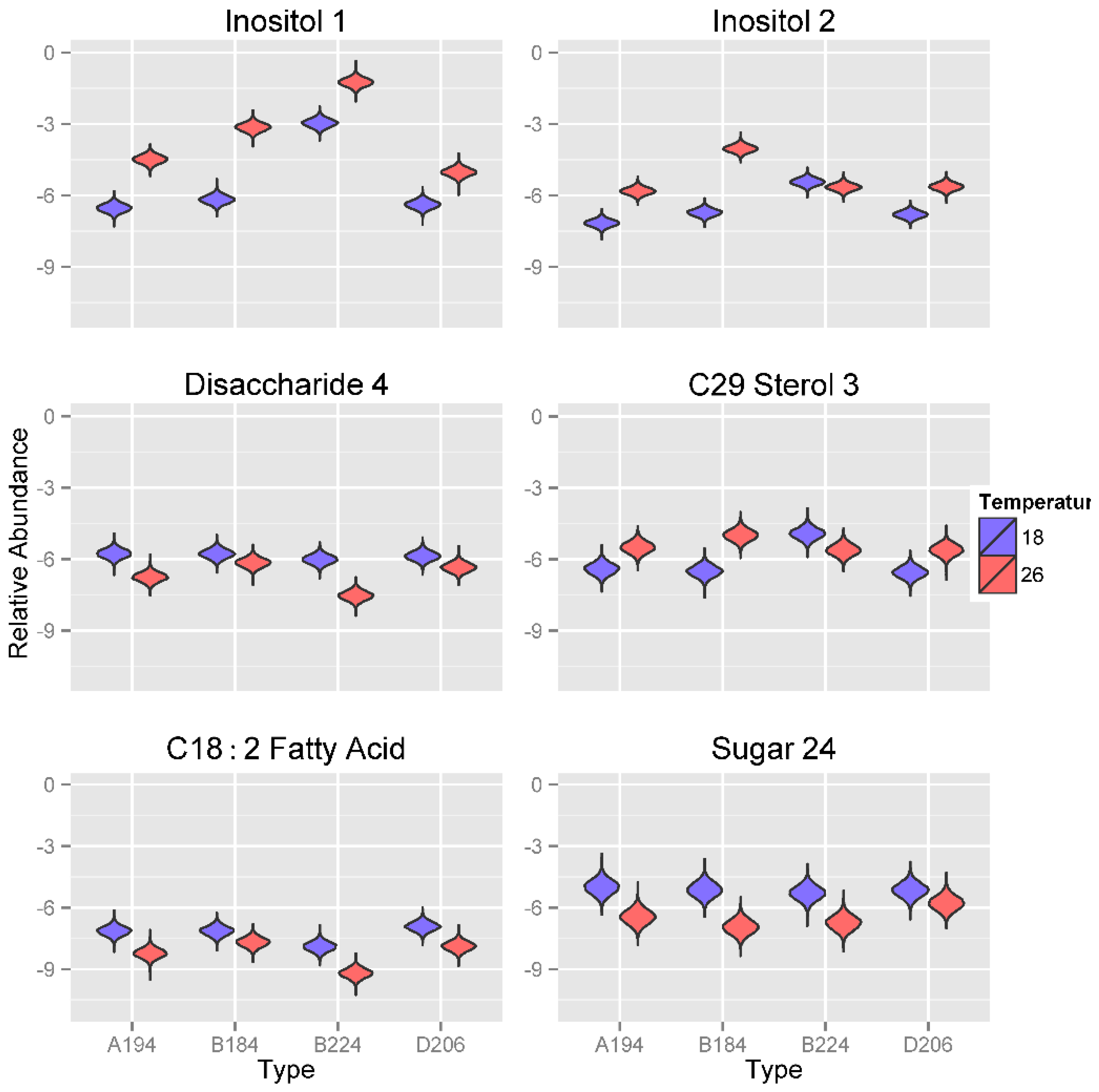 Metabolite abundance values of the sugars Inositol 1 and 2 respond strongest to changes in temperature (Figure 6). The abundance values of these two metabolites are significantly lower at 18 °C compared to 26 °C, usually by two orders of magnitude. The only exception to this pattern is the metabolite abundance of Inositol 2 for Symbiodinium type B224, which shows similar expression at both temperatures. Furthermore, metabolite abundance of Inositol 1 is significantly greater in Symbiodinium type B224 compared to all other three Symbiodinium types. Interestingly, Symbiodinium type B224 is more commonly found in temperate environments whereas Symbiodinium types A194, B184 and D206 are commonly found in tropical and sub-tropical environments. Such adaptation is likely to be advantageous to unique symbiont-host combinations and interactions (e.g., [65,66,67]). Symbiodinium types cultured at 18 °C show significantly greater abundance values of Disaccharide 4, with the greatest difference being observed for Symbiodinium type B224. For C29 Sterol 3, Symbiodinium types cultured at 18 °C had significantly lower metabolite abundance values in all Symbiodinium types except for Symbiodinium type B224, for which relative concentrations were significantly larger at 18 °C compared to the three other Symbiodinium types. All Symbiodinium types cultured at 18 °C were also characterized by greater metabolite abundances of the di-unsaturated fatty acid C18:2 and an unknown sugar, (Sugar 24).
