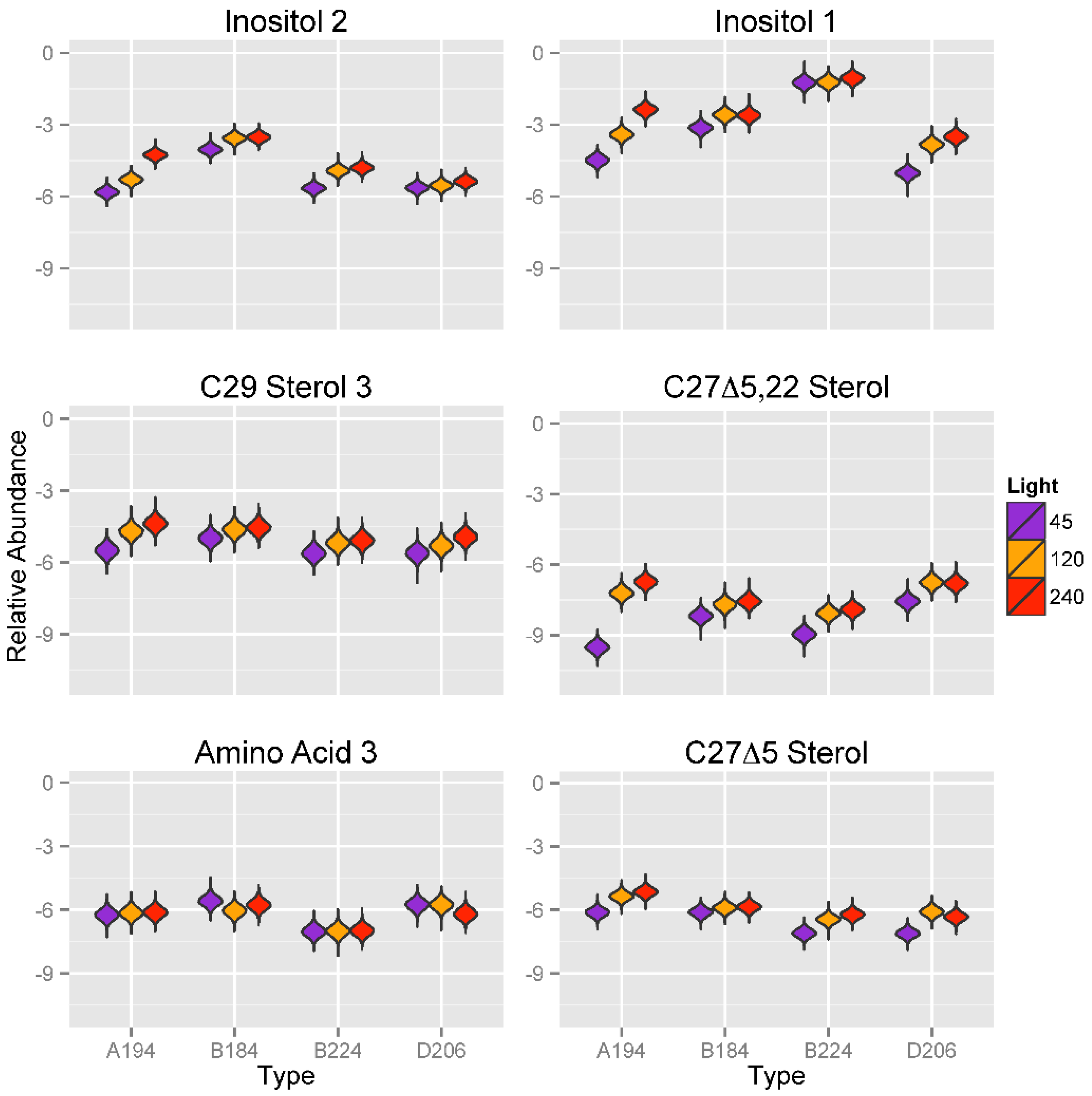 A strong effect of light intensities on the expression of two inositol compounds was identified (Figure 7). Except as noted below, for most Symbiodinium types, the metabolite abundance values of inositol compounds (Inositol 1 and 2) was significantly lower at 45 μmol photons m−20 s−1 than it was at the higher light intensities of 120 or 240 μmol photons m−20 s−1, at which abundance values tended to be similar. There were three exceptions to this pattern; Symbiodinium type A194 showed an increase for both inositol compounds from 45 to 240 μmol photons m−20 s−1, which was of approximately two orders of magnitude for Inositol 1. Metabolite abundances of Inositol 2 in Symbiodinium type D206, and Inositol 1 in Symbiodinium type B224 are similar at 45 and 120 μmol photons m−20 s−1 and only slightly elevated in 240 μmol photons m−20 s−1. A similar pattern of lower relative concentrations at lower light intensities was also seen for the three sterols, C29 Sterol 3, C27Δ5.220 Sterol 2, and C27Δ5 Sterol. For C27Δ5.22 Sterol, Symbiodinium type A194 had a dramatic increase in metabolite abundance of more than two orders of magnitude between 45 and 240 μmol photons m−20 s−1, greater than that seen for Inositol 1.