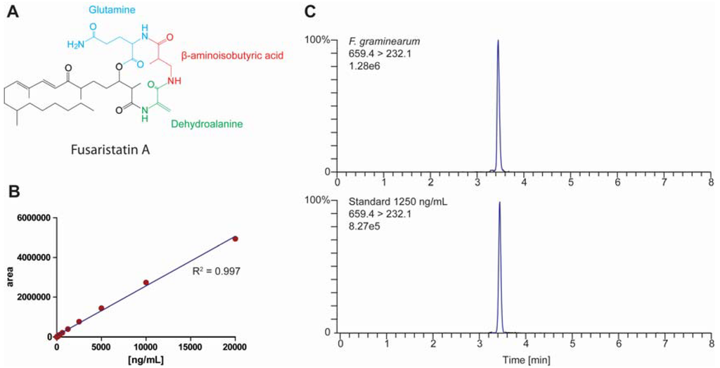Fusaristatin A ionized very well under the selected conditions, which was reflected in the signal to noise ratios of the three product ions ranging from 13023 to 32153 in the lowest standard concentration (19.5 ng/mL). Fusaristatin A was quantified using the transition 659.4 > 232.1 m/z in a linear manner (R2 = 0.997, Figure 1B) in the standard series (19.5–20,000 ng/mL) as a single peak in the standard series and in the Fusarium extract (Figure 1C). This standard curve was used to quantify the fusaristatin A levels in the F. graminearum extracts.
