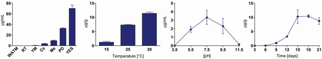 Production of fusaristatin by F. graminearum on seven different media, on Cz medium at pH 3.5–11.5, on YES medium after 3–days and on YES medium at 15–30 °C. The experiments were performed with 4–5 replicates and error bars represent standard error of mean (SEM).