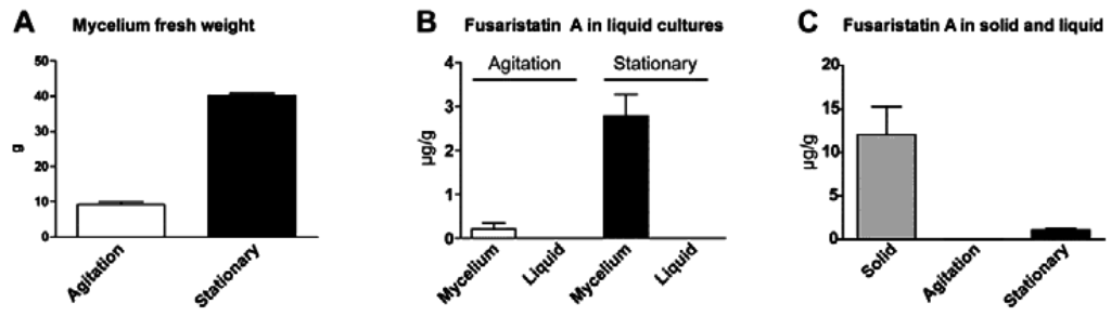 (A) Weight of mycelium F. graminearum in agitated (90 rpm) and stationary liquid YES medium after incubation for two weeks at 25 °C. (B) Production of fusaristatin A in agitated and stationary cultures (µg/g fresh mycelium and lyophilized medium). (C) Comparison of fusaristatin A yield in solid and liquid cultures (µg/g cultivation medium). The experiments were performed in triplicate and the error bars represent standard error of the mean (SEM).