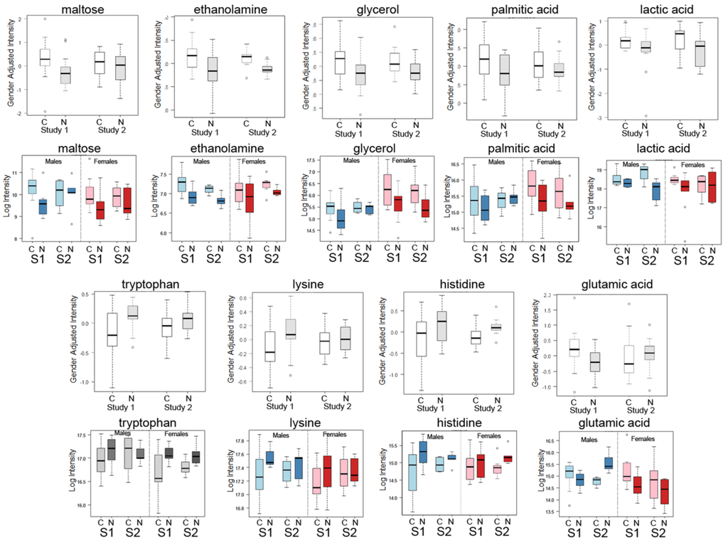Box-whisker plots of top metabolite candidates in Study 1 and Study 2 with additional plots of the same metabolites from each study separated by gender (males and females). Box-whisker plots of gender adjusted intensities of top known metabolite candidates from Study 1 (S1) compared with the same compounds in Study 2 (S2) for cancer cases (C) and normal/control (N) showing similarity in the changes in both studies are shown for nine of the top metabolites: maltose, ethanolamine, glycerol, palmitic acid, lactic acid, tryptophan, lysine, histidine and glutamic acid. Shown below each metabolite plot are results for the same metabolites separated by gender. Blue plots denotes male results only and red plots denote females results only for each study.